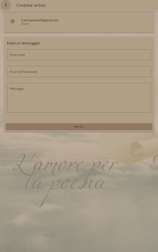 Benvenuti nell\app dell\artista Francesco Vasciarelli, un\immersione digitale nel mondo affascinante della sua arte unica. Scoprite e connettetevi con l\universo creativo di Francesco Vasciarelli attraverso una galleria digitale organizzata, progettata per offrire un\esperienza completa e coinvolgente. Ecco cosa vi aspetta: - Connessione Personale: L\app offre un punto di accesso diretto per instaurare una connessione autentica tra gli amanti dell\arte e l\artista stessa, rendendo l\esperienza più personale e coinvolgente. - Fruizione Unica: Unendo la facilità di navigazione alla possibilità di interazione diretta, l\app offre un modo unico per esplorare e connettersi con l\arte di Francesco Vasciarelli, creando un ponte tra l\artista e il suo pubblico. Benvenuti in un\esperienza artistica senza precedenti!