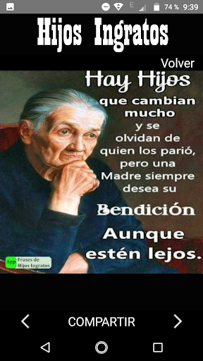 Nuestra app Frases para Hijos Ingratos, es una app dedicada a todos esos hijos que de una u otra manera son desagradecidos con nosotros los padres. Mostraremos dos secciones de Frases para Hijos: La primera contiene numerosas imágenes con mensajes alusivos a nuestros ingratos Hijos. la segunda sección cuneta con un listado de frases tipo texto, de la cual podrás escoger aquella que mas se adapte a tu situación. Sabemos que nuestros hijos son el mejor regalo que tenemos pero muchas veces ellos se olvidan de nosotros como padres, es por este motivo que dedicamos esta app a ellos para hacerles llegar a través de nuestros estados en WhatsApp, Instagram, Facebook o cualquier red social ya sea con una imagen o una frase que les haga recordar que existimos y que necesitamos un poco de su atención. Estas frases de Hijos desagradecidos o ingratos es una recopilación única que podrás usar cuando mas lo necesites, es importante mencionar que no requiere internet para ver y descargar las imágenes o frases, mas si para compartirlas en tus redes sociales.