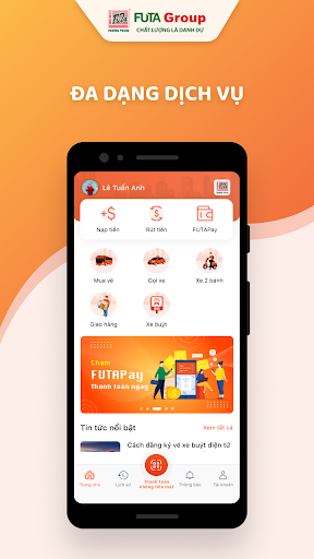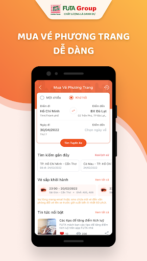 Với siêu ứng dụng FUTA, FUTA Group mong muốn trở thành cầu nối giữa mọi khách hàng và người cung cấp dịch vụ, trở thành một dụng không thể tách rời trong cuộc sống hằng ngày của mỗi người Việt Nam Các dịch vụ cung cấp trong ứng dụng FUTA: Vé xe FUTA Bus Lines : Mua vé xe Phương Trang nhanh chóng, với nhiều đợt ưu đãi. Tích hợp thanh toán đa dạng với ví điện tử, thẻ ngân hàng.... Giao hàng tận nơi: Dịch vụ giao hàng chuyên nghiệp dành riêng cho người bán hàng online. Tận hưởng những trải nghiệm giao nhận nhanh chóng - an toàn - tiết kiệm, giúp người bán hàng bán được nhiều hơn, người mua hàng hài lòng hơn. Gọi xe Taxi, Ô tô, Xe máy : Cung cấp dịch vụ kết nối giữa hành khách và lái xe Taxi, Ô tô trong thành phố với việc biết trước giá cước chuyến đi. Xe hợp đồng: Đi dạo vòng quanh thành phố, đi du lịch ngắn ngày hay đi công tác dài ngày ? Với FUTA, bạn có thể dễ dàng thuê xe ngay trên điện thoại di động bất cứ khi nào và tại bất cứ đâu để tận hưởng những chuyến đi thật tuyệt vời bên gia đình và bạn bè. ƯU ĐÃI KHÁCH HÀNG Sử dụng FUTA cho nhu cầu mua vé du lịch, đi lại, vận chuyển, bạn còn có cơ hội tích luỹ điểm sau chuyến đi: -Đổi điểm để mua vé xe Phương Trang và giao hàng hoá đi tỉnh -Miễn phí, giảm giá… khi đặt xe di chuyển từ bến bãi Phương Trang về nhà và ngược lại -Đặt xe giá rẻ di chuyển trong thành phố Với quyết tâm trở thành người tiên phong tạo ra những chuẩn mực mới về chất lượng, chúng tôi cam kết luôn đặt sự hài lòng của khách hàng là trọng tâm trong từng hành động dù là nhỏ nhất. Với chúng tôi: CHẤT LƯỢNG LÀ DANH DỰ. Hãy trải nghiệm FUTA ngay – chúng tôi hân hạnh được lắng nghe và phục vụ bạn!