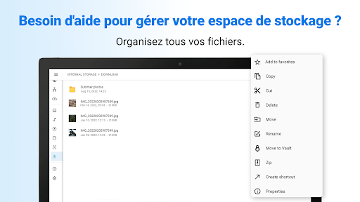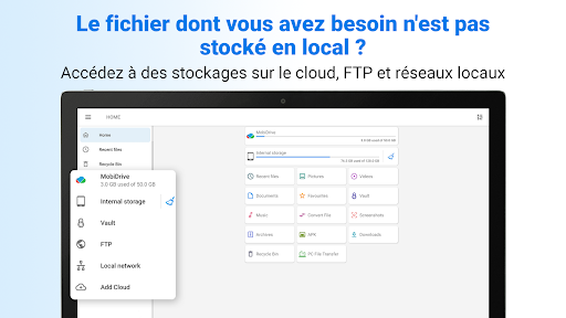Vos photos, vidéos et documents sont-ils importants pour vous ? Bien entendu ! C\est pour cela que depuis près de 20 ans nous développons et entretenons File Commander ! Notre gestionnaire et explorateur de fichiers vous permet d\organiser, protéger et dissimuler vos fichiers locaux, cloud et réseau et d\en garder le contrôle. File Commander est optimisé pour Android 13 et vous offre un accès gratuit à 5 Go de stockage sur le cloud MobiDrive en plus de ses fonctionnalités de gestion et de protection : coffre-fort où dissimuler et chiffrer vos fichiers, corbeille, analyseur de stockage, convertisseur. File Commander pour TV vous permet de contrôler la mémoire de votre Android TV avec des fonctionnalités de gestion de fichiers conviviales. Avez-vous déjà voulu dissimuler vos photos, vidéos et documents sensibles pour limiter leur accès ? Notre explorateur de fichiers protège vos photos et vidéos personnelles en les verrouillant avec un code PIN, une authentification par empreinte digitale ou un mot de passe. Le coffre-fort de File Commander et son modèle de chiffrement zero-knowledge sont la cachette ultime de vos fichiers les plus précieux. Oubliez les avertissements système d\espace de stockage insuffisant ! L\analyseur de stockage vous aide à libérer de l\espace pour vos applications et fichiers importants en vous montrant les éléments qui occupent le plus d\espace et en vous suggérant les fichiers à supprimer ou à déplacer. Trouvez facilement vos fichiers, quel que soit leur emplacement ! File Commander est un explorateur qui classe vos fichiers sur un écran d\accueil facile d\accès et entièrement personnalisable. Accédez rapidement à vos photos, téléchargements, musiques, vidéos et documents préférés sur votre appareil et sur tous vos cloud externes et réseaux locaux. Accédez à tous vos fichiers multimédias sur votre téléphone depuis l\application ! Le lecteur audio et vidéo intégré vous permet de lire, gérer et accéder rapidement à tous vos fichiers préférés sur vos téléphone, tablette et téléviseur. Ne manquez jamais de stockage! File Commander vous offre 5 Go de stockage gratuit sur le cloud MobiDrive (50 Go avec Premium). Partagez facilement vos fichiers et dossiers et ouvrez-les sans connexion Internet. Zut ! Format non pris en charge. Avec File Commander, gérez facilement une large gamme de formats de fichiers. Finis les types de fichiers incompatibles ! Avec la conversion de fichiers, transformez n\importe quel fichier audio et vidéo incompatible en un fichier mp3, mp4, WMV, MOV, etc. Convertissez rapidement n\importe quel PDF en photo ou en document. Avec plus de 1 200 formats pris en charge, vous n\aurez plus jamais à vous soucier des problèmes de compatibilité! Organisez plusieurs cloud simultanément! File Commander centralise et gère tous vos fichiers et dossiers cloud. Vous n\avez pas besoin de télécharger vos fichiers, notre solution de gestion facilite l\exploration, la navigation et le transfert de fichiers entre les services cloud les plus utilisés : Google Drive, DropBox, OneDrive, OneDrive for Business et Box. Avez-vous déjà accidentellement supprimé un fichier et pensé qu\il était perdu à jamais? Notre solution de gestion de fichiers évite les suppressions accidentelles de fichiers ! Avec la corbeille de recyclage de File Commander, chaque fichier et dossier que vous supprimez du stockage interne ou de la carte SD de votre appareil peuvent être restaurés et gérés. Besoin d\aide pour des transferts de fichiers entre PC et Android? Le transfert de fichiers pour PC est fait pour vous ! Notre solution vous propose un processus de transfert de fichiers simple et efficace qui utilise le Wi-Fi de votre domicile pour transférer facilement des fichiers dans les deux sens. Si vous êtes à la recherche d\une solution de gestion de fichiers complète et conviviale, téléchargez File Commander dès aujourd\hui!