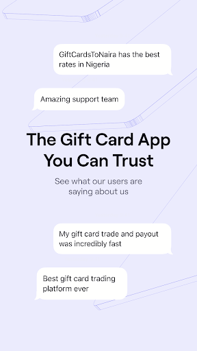 Introducing GiftCardsToNaira Version 3.0: Experience the pinnacle of gift card trading with our refined user interface, enhanced trading features, and an all-new Rewards system, all while selling at highly competitive rates. Discover the premier app for redeeming, selling, or trading gift cards for instant cash in Nigerian Naira or Ghanaian Cedis. With Version 3.0, we have refined the GiftCardsToNaira experience to provide a seamless and efficient gift card trading process at attractive rates. HIGHLIGHTS OF VERSION 3.0: * Enticing Rewards System: Capitalize on extra earnings by selling your gift cards through our cutting-edge trading point system, leaderboard, poll challenges, promotional codes, and referral bonuses. * Refined User Interface: Immerse yourself in a sophisticated and user-friendly app layout designed for streamlined navigation. * Optimized Gift Card Trading: Benefit from an expedited trading process with rapid confirmations and effortless navigation, all while selling your gift cards at highly competitive rates. SIMPLE AND SWIFT TRADING PROCESS Selling your gift card has never been more straightforward and prompt. Simply create an account, add your Nigerian bank account or Ghanaian Mobile Money number for withdrawals, and commence trading. SUPPORT FOR 20+ GIFT CARDS Trade up to 25 different gift cards within the app, including Steam, Apple iTunes, Sephora, Vanilla, Amex, Nike, Nordstrom, and many more. RAPID CONFIRMATIONS At GiftCardsToNaira, we understand the value of efficient trading and prompt payment, which is why our app has been tailored to meet those needs. TRUST AND SECURITY Our platform is renowned for its reliability, and we have implemented robust security measures for your peace of mind. EMBARK ON YOUR JOURNEY GiftCardsToNaira is dedicated to providing unparalleled choice, opportunity, and experience. Begin your journey to success today with Version 3.0! 24/7 CUSTOMER SUPPORT Should you have any questions, suggestions, or concerns, please contact us at info@giftcardstonaira.com or reach out to us on Instagram/Twitter at @gctonaira.