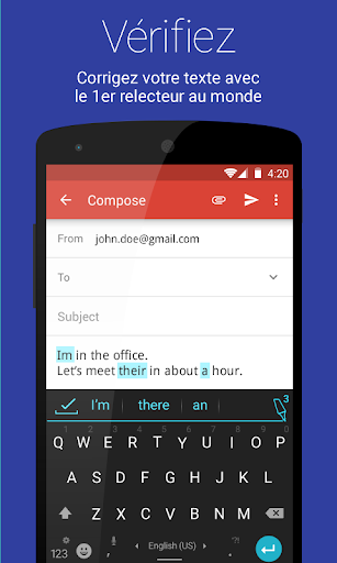 Le meilleur clavier au monde enfin disponible en français ! Une application incontournable sur Google Play ! Améliorez votre niveau et votre vitesse d\écriture avec le clavier le plus intelligent du moment ! – 100 % GRATUIT Ginger Clavier est une application incroyablement intelligente qui transforme l\écriture en une expérience divertissante ! ★ Intelligence – Vérification de la grammaire anglaise Essayez d\écrire « He wants his teddy bare » et voyez le résultat ! Ginger Clavier est le seul clavier capable de corriger votre grammaire anglaise, votre orthographe et votre ponctuation de manière rapide et efficace. Et puisque vous avez le meilleur correcteur de grammaire anglaise entre les mains, vous pouvez désormais vous concentrer sur votre vitesse de frappe. ★ Fun – Emoji Un emoji vaut mille mots ! Choisissez parmi des centaines de superbes emojis pour intégrer vos émotions dans votre texte. Avec Ginger Clavier, vous pouvez ajouter des emojis (émoticônes) à votre écriture où vous le souhaitez . Ajoutez de la saveur à vos messages écrits, à vos statuts Facebook et même à vos e-mails ! Le clavier à saisie rapide et emojis est enfin arrivé ! ★ Intelligence – fonction texte prévisible – en français ! Fonctionne comme les autres claviers prédictifs – mais en BEAUCOUP MIEUX. Ginger Clavier est capable de deviner les mots à venir en fonction du contexte. Vous serez impressionné par la précision de la saisie intuitive. ★ Fun – Saisie par glissement Écrivez bien plus vite grâce à la saisie Stream (par glissement). Tapez trois fois plus vite, sans jamais soulever votre doigt de l’écran ! ★ Fun – Thèmes pour clavier Utilisez un clavier personnalisé en accord avec votre style ! Choisissez parmi des dizaines de thèmes magnifiques pour clavier et personnalisez votre expérience d’écriture ! Utilisez Stream (saisie par glissement) pour voir votre vitesse d\écriture instantanément multipliée par deux, voire trois. ★ Page Ginger : des tonnes de fonctionnalités intelligentes et divertissantes supplémentaires ! Dictionnaire personnel – Ajoutez de l\argot, des noms, des lieux et d\autres mots pour une expérience d\écriture Ginger personnalisée. Lecteur de texte – Une fonction texte-parole avec voix humaine vous permet d\entendre votre texte lu à voix haute. Favoris – Enregistrez vos textes comme modèles pour une utilisation ultérieure. Traducteur – Traduit en 58 langues : traducteur français-anglais et plus encore ! Correcteur d\orthographe – Évitez les fautes d\orthographe ! Ginger Clavier prend en charge jusqu\à 58 langues (vous trouverez la liste complète dans notre Centre d\aide) – Aide à la traduction pour les langues suivantes (vous trouverez la liste complète dans notre Centre d\aide) – ** Ginger respecte votre confidentialité. Ginger Clavier ne conserve aucun champ de mot de passe. L\utilisation de cette application s\inscrit dans le cadre de notre politique de confidentialité : htttp://www.gingersoftware.com/termsandprivacy/ **