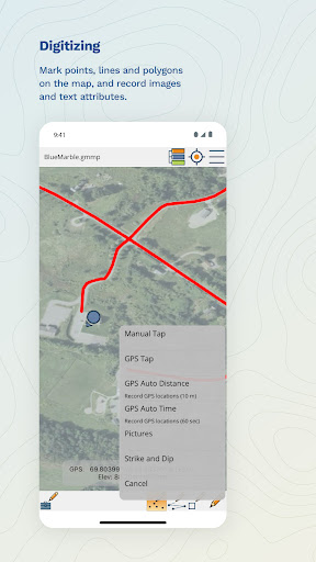 Global Mapper Mobile Bring your GIS workflow to the field. Global Mapper Mobile is a powerful Android application for viewing and collecting GIS data. It utilizes the GPS capabilities of mobile devices to provide situational awareness and locational intelligence for remote mapping projects. A perfect complement to the desktop version of Global Mapper, the mobile app provides maps-in-hand functionality for engineers, surveyors, wildlife managers, foresters, and anyone whose job requires access to spatial data in remote locations. Global Mapper Mobile can display vector, raster, and elevation data layers that have been transferred from the desktop version of the software. It also provides tools for drawing, tracking, and form-based data collection using pre-configured attributes and picklists. Global Mapper Mobile Base Version (Free) The base version of Global Mapper Mobile is free of charge and provides an array of features and functions, including: • Vector, raster, and terrain data display • GPS location display • Point, line, and polygon feature creation using GPS location • Editing of existing vector features • Capture of images in the field • Creation of Picture Points from geotagged images • Attribute and feature notation recording for new or existing vector features • Online access to Open Street Map data Global Mapper Mobile Pro The Pro version of Global Mapper Mobile, available as an in-app purchase, supplements the functionality of the base version with an array of professional-grade tools, including: • Advanced GPS support for connection to high-accuracy GNSS devices from vendors such as Bad Elf, EOS, Juniper, and others • RTK correction via built-in NTRIP client • GPS Averaging • Terrain shader and water level display options • Custom online source options and online data saving for offline use • Simultaneous feature creation • Viewshed creation • Volume calculation • Contour Creation • Data reprojection • Address searching • Geopackage and GeoPDF format support Global Mapper Mobile Pro is available for purchase from the Blue Marble Geographics website. The license is based on an annual subscription from the date of purchase that can be renewed each year. Enterprise licensing options are also available. For more information, email orders@bluemarblegeo.com. Note: Continued use of GPS running in the background can dramatically decrease battery life. Privacy Policy: https://www.bluemarblegeo.com/privacy-policy/ Terms of Use: https://www.bluemarblegeo.com/licensing-policy/