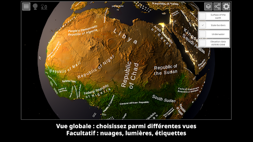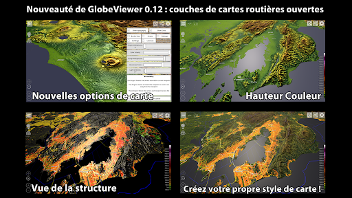 Cette application offre une vue de haute qualité de la surface de notre planète bleue. Il est divisé en deux zones : la vue globale rotative sous forme de globe interactif et un affichage cartographique 3D haute résolution de la topographie de la Terre. - Globe 3D interactif avec carte de surface, sous-marine et topographique - Ensemble de cartes topographiques 3D haute résolution de l\ensemble de la surface terrestre - divisé en 22 912 tuiles individuelles. Vous pouvez charger 110 régions différentes sur le globe interactif, qui présentent ensuite les nombreuses tuiles individuelles de manière judicieuse et les rechargent automatiquement. L\application ne contient initialement que les textures du globe en basse résolution. Tous les téléchargements requis sont automatiquement chargés depuis notre serveur. Au total, environ 105 Go de données sont disponibles. Les données restent mises en cache sur votre appareil pour une utilisation hors ligne, mais peuvent être supprimées à tout moment depuis le menu principal. De plus, tous les événements enregistrés par GDACS, tels que les ouragans, les tremblements de terre, etc., sont enregistrés sur le globe. La carte topographique 3D est basée sur les données d\élévation de la sonde Terra de la NASA, qui a enregistré 83° des hémisphères nord et sud entre 2000 et 2013 - cela donne l\ASTER3-DEM. Avec la version 0.10.0, la carte est enrichie d\environ 7,5 millions de noms de lieux provenant de geonames.org. Cela signifie que toutes les villes, montagnes, lacs, déserts et bien d’autres caractéristiques géographiques qui y sont répertoriées sont affichées sur la carte. A partir de la version 0.12.0, les données d\OpenStreetMaps (bâtiments, frontières, rues...) sont également disponibles sur les tuiles - mais uniquement pour les démos et les cartes achetées. Utilisez le didacticiel de l\application pour vous familiariser rapidement avec celle-ci ou lisez le manuel pour découvrir les fonctions contenues dans cette application. L\application étant encore en développement, certaines fonctionnalités peuvent encore changer. Nous espérons que vous apprécierez l\utilisation de GlobeViewer !