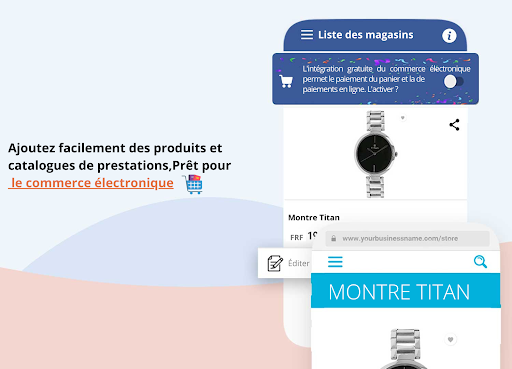 Créez votre site Web, votre boutique de commerce électronique et votre blog instantanément grâce à notre créateur de site Web instantané : l\application Websites.co.in Créez, créez, mettez à jour et gérez votre site Web via votre smartphone, votre ordinateur portable ou votre ordinateur de bureau de manière simple et sans tracas. Aussi, obtenez votre site Web classé pour vos recherches basées sur la localisation sur Google :) ☆ Aucune compétence technique nécessaire. ☆ Aucune carte de crédit requise. ☆ Commencez l\essai sans risque maintenant. Combien de fois vous a-t-on demandé : \Quelle est votre adresse Web/Puis-je voir vos produits en ligne ?\. Il est temps de répondre à ces questions avec votre site Web Créez ou gérez votre site Web ou votre blog directement depuis votre appareil Android. Créez et mettez à jour des publications, des pages, des photos et des vidéos. Affichez les statistiques et recevez des alertes instantanées sur les demandes d\informations commerciales via les notifications d\application, les e-mails et les SMS. Modifiez le contenu de votre site Web via notre application de création de site Web ou notre tableau de bord Web sans aucune aide extérieure. Nous aidons votre entreprise à être découverte plus rapidement sur les recherches basées sur la localisation de Google et à générer plus de trafic vers votre site Web. Plus de trafic sur votre site Web se convertit en plus de prospects, plus d\affaires et plus de profit. Notre application de création de site Web instantanée vous permet également de télécharger rapidement et facilement vos produits et services sur votre site Web et de les vendre en ligne. Tout cela à partir d\une simple application mobile et d\une plate-forme Web avec une interface aussi simple que de télécharger la mise à jour de votre statut Facebook. Avec zéro codage ou compétences techniques, faites-nous confiance... HTML, CSS, PHP, etc., c\est du jargon et vous n\avez pas besoin de le connaître. Nous le pensons. COMMENT OBTENIR UN SITE WEB D\ENTREPRISE VIA NOUS VOUS AUGMENTE PLUS D\AFFAIRES ? 1.) Mettez votre entreprise en ligne instantanément grâce à notre application de création de site Web instantané ou à notre plateforme Web Website Maker 2.) Mettez régulièrement à jour votre site Web avec des mises à jour, des offres et des promotions. Vos mises à jour sont également automatiquement partagées sur vos profils de réseaux sociaux. Plus vous mettez à jour, plus vous obtenez d\affaires! 3.) Votre site Web est découvert, vous classe mieux dans la recherche Google et vous donne plus de trafic sur votre site Web. Le trafic de votre site Web se convertit en plus de prospects, plus de ventes et plus de profits. Une fois que vous avez créé votre site Web, il sera publié instantanément sous un nom de domaine gratuit \.websites.co.in\, par ex. \VotreNomEntreprise.sitesweb.co.in\. Si vous êtes bon avec cela, votre site Web sera gratuit à vie ! Website Builder Features List:- Free Domain Name, ( eg: YourCompanyName.com, .net, .org, .info, .in etc. ) Free Hosting, Unlimited Updates, Photos, Product listings, E-commerce functionality, Cash On Delivery, Get Business Enquiries, Statistics, Alerts, Powerful Auto-SEO, Unlimited SEO Keywords Optimisation, Easy Auto Social Media, Geo Tagging, Corporate Email Id, Integrations with Facebook pixel, Google Analytics, Whatsapp messaging, Facebook chat, Google Translate and adding more features monthly. ☆ Créez votre site Web en important votre page Facebook en un clic. Connectez-vous et importez simplement votre page Facebook et votre site Web sera créé en important le contenu de votre page Facebook Business en un clic. Avec notre application de création de site Web, vous pouvez gérer votre entreprise n\importe où, n\importe quand via votre téléphone portable lors de vos déplacements.
