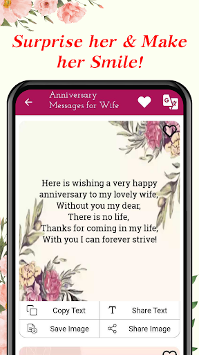Wedding Anniversary Wishes will help you find the perfect anniversary wishes, marriage anniversary wishes, and more to make your loved one\s special day memorable. Send anniversary card messages, first anniversary poems, and anniversary poems to parents. among others and make them feel loved and cherished. Discover tons of anniversary wishes for husband, 25th anniversary messages, wedding anniversary wishes, and poems that will convey precisely what you feel in your heart. this is the only app you will ever need to find the most amazing wishes that express your true feelings. Not only can you send the best anniversary cards and wishes, but you can also copy the text from the wishes to send as a personalized DM to your loved ones. Share your favorite anniversary wishes on your social media of share via WhatsApp. Check out the amazing library of anniversary wishes, anniversary poems, and marriage anniversary wishes that make our app Wedding Anniversary Wishes one of a kind: > 25th Anniversary Messages > 5th-anniversary Poems > Anniversary Card Messages > Anniversary Messages > Photo Collage > Anniversary Messages For Parents > Anniversary Messages For Husband > Anniversary Messages For Wife > Anniversary Poems > Anniversary Poems For Parents > Anniversary Wishes > First Anniversary Messages > First Anniversary Poems > Happy Anniversary Messages > Religious Anniversary Wishes 1) Want to wish your parents on their anniversary in the most beautiful way? Check out the heartwarming messages in the anniversary messages for parents section to wish them on their special day and convey how glad you are to have them in your life. 2) Want to sweep your better half off the floor and make them feel loved and appreciated? Anniversary messages for husband and anniversary messages for wife have the most heartfelt, sincere, and loving anniversary messages and poems that will show them how much they mean to you and how lucky you feel to have them in your life. 3) Want to wish your loved ones on completing their silver jubilee? Take a look at all the awesome messages and greetings in the 25th Anniversary Messages section and choose from your favorite ones. Here\s what makes Wedding Anniversary Wishes the perfect app for you to send the best messages and greetings imaginable: > Choose from the best anniversary wishes, happy wedding anniversary, and marriage anniversary wishes, among others, and convey exactly what you feel in your heart. > You can change the background of all anniversary messages.. there are lots of options to choose from! > There are multiple options available to you with what you want to do with your wishes. you can save the image and send them as DMs, share the image on your social media, copy the text as personalized messages and so much more. > You can find hundreds of anniversary wishes for all occasions in a single app, making it the go-to app for the most beautiful words for your loved ones. > Everybody can easily browse and send anniversary pictures and messages in this app, thanks to the easy-to-use user interface. Now you do not have to spend hours browsing and looking to send the perfect anniversary wishes. Get the perfect anniversary wishes for husband, anniversary wishes for wife, wedding anniversary wishes, 25th anniversary wishes and more anytime you want easily. Download Wedding Anniversary Wishes and show your loved ones how much you care with the sweetest and most heartfelt anniversary wishes and poems.