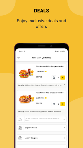 Hardee’s Egypt food app is now available on your fingertips. Ordering food online has never been this exciting. Indulge in our 100% Angus beef thickburger, chargrilled burgers, beef sandwiches & more from the comfort of your home. Avail tempting deals and offers now at the Hardee\s restaurant near you. Do not miss out on our meals, combos & deals!. If you are on the go, takeaway your favorite meal by visiting our nearby restaurant. Go all in with our delightful food offers at Hardee’s and have a great time with your family and friends. Hardee\s Egypt understands the current situation and the need to be home and safe. You can r download our Hardee\s Egypt app today to enjoy delicious thickburgers, cheese burgers, steak & more from the comfort of your home! Just a few taps away from ordering your favorites, Follow the below steps. 1. Download the Hardee’s Egypt App. 2. Choose the preferred language based on preference. 3. Check your favorite items categorized as part of the menu. 4. Add your wish list to the cart. 5. Log in to use your saved addresses or continue as a Guest. 6. Choose a mode of ordering as takeaway or delivery. 7 Select your location and provide delivery address. 8. Proceed to check out and make payment 9. Track your order and enjoy quick delivery. 10. Relish the food delivered at your doorstep. Why use our Food Delivery App: *Exclusive Hardee’s Menu Order from the variety of choices - Angus Thickburgers, burger meal deals, Chicken Burgers, sides, desserts & beverages. Enjoy from a wide array of Chicken & Beef burgers, sandwiches and much more! Our Top-sellers: • Angus Thickburgers • Chargrilled burgers • Chicken Burgers • Angus beef sandwiches • Delicious Philly cheese steak & fillet burger • Choice of sides, desserts & beverages. • Varieties of kid’s meals. • Value Meals. *Personalized Food Cart: Customize your burgers, sandwiches, sides, desserts, or combos with a wide variety of condiment and add-on options. *Order History: We remember all your orders, you can now view and make your pick from a list of your favorite product shortlisted and customized. *Easy payments: Paying online has never been so hassle free, with multiple payment options (including Cash on Delivery, online payments like (Credit/Debit Cards etc.) at your fingertips. *Exciting Offers: Get exclusive Hardee’s Coupons, Offers & Deals customized only for you so it leaves you wanting for more and get rewarded at the time of you order. Choose from variety of burger meals & deals on combos & feast today! *Track your orders: Get notified and know your order status LIVE on the app without the hassle of calling. *My Account: Why spent time on multiple Apps when a single food delivery App can sort you in many ways. Follow our login process which now can be done via a social mode. Use your Google or Facebook or Apple account to log in our App. *Have any feedback or queries? Hardee\s customer care is happy to help you! Call us at +(965) 1888333, For more details, please log into https://www.hardees.com.eg