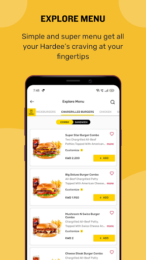 Hardee’s Kuwait food app is now available on your fingertips. Ordering food online has never been this exciting. Indulge in our 100% Angus beef thickburger, chargrilled burgers, beef sandwiches & more from the comfort of your home. Avail tempting deals and offers now at the Hardee\s restaurant near you. Do not miss out on our meals, combos & deals!. If you are on the go, takeaway your favorite meal by visiting our nearby restaurant. Go all in with our delightful food offers at Hardee’s and have a great time with your family and friends. Hardee\s Kuwait understands the current situation and the need to be home and safe. You can call now on our Hardee\s contact number or download our Hardee\s Kuwait app today to enjoy delicious thickburgers, cheese burgers, steak & more from the comfort of your home! Just a few taps away from ordering your favorites, Follow the below steps. 1. Download the Hardee’s Kuwait App. 2. Choose the preferred language based on preference. 3. Check your favorite items categorized as part of the menu. 4. Add your wish list to the cart. 5. Log in to use your saved addresses or continue as a Guest. 6. Choose a mode of ordering as takeaway or delivery. 7 Select your location and provide delivery address. 8. Proceed to check out and make payment 9. Track your order and enjoy quick delivery. 10. Relish the food delivered at your doorstep. Why use our Food Delivery App: *Exclusive Hardee’s Menu Order from the variety of choices - Angus Thickburgers, burger meal deals, Chicken Burgers, sides, desserts & beverages. Enjoy from a wide array of Chicken & Beef burgers, sandwiches and much more! Our Top-sellers: • Angus Thickburgers • Chargrilled burgers • Chicken Burgers • Angus beef sandwiches • Delicious Philly cheese steak & fillet burger • Choice of sides, desserts & beverages. • Varieties of kid’s meals. • Value Meals. *Personalized Food Cart: Customize your burgers, sandwiches, sides, desserts, or combos with a wide variety of condiment and add-on options. *Order History: We remember all your orders, you can now view and make your pick from a list of your favorite product shortlisted and customized. *Easy payments: Paying online has never been so hassle free, with multiple payment options (including Cash on Delivery, online payments like (Credit/Debit Cards etc.) at your fingertips. *Exciting Offers: Get exclusive Hardee’s Coupons, Offers & Deals customized only for you so it leaves you wanting for more and get rewarded at the time of you order. Choose from variety of burger meals & deals on combos & feast today! *Track your orders: Get notified and know your order status LIVE on the app without the hassle of calling. *My Account: Why spent time on multiple Apps when a single food delivery App can sort you in many ways. Follow our login process which now can be done via a social mode. Use your Google or Facebook or Apple account to log in our App. *Have any feedback or queries? Hardee\s customer care is happy to help you! Call us at +(965) 1888333, For more details, please log into https://www.hardees.com.kw