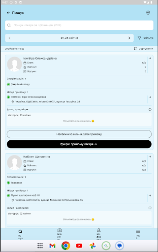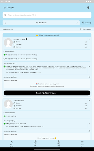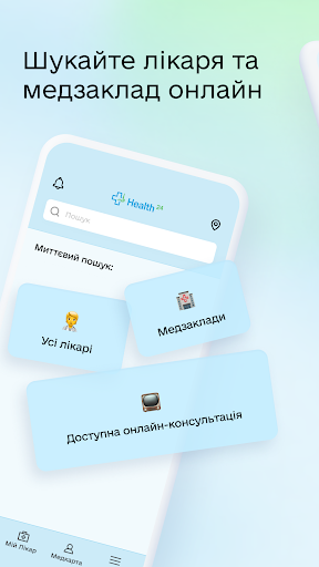 Health24 — медичний онлайн сервіс для запису до лікаря та ваш особистий медичний кабінет. Забудьте про черги в реєстратурі та паперові медичні картки. Тепер ваші медичні дані з електронної охорони здоров\я України (e-Health) доступні просто у вашому смартфоні! Health24 робить послуги eHealth максимально доступними та зручними. Записуйтесь на прийом до лікаря всього в кілька кліків: просто оберіть потрібного спеціаліста та вільний час для візиту. Якщо ваші плани зміняться, ви завжди можете скасувати або перенести запис прямо в додатку. Хочете записати на прийом дитину, чоловіка, батьків чи підопічного? Додайте пов’язану особу до свого кабінету та записуйте на прийом. Знайти потрібного лікаря стало ще простіше завдяки зручній системі пошуку та фільтрації. Обирайте спеціалістів за їхнім фахом, статтю, можливістю проведення онлайн-консультації та якщо ви шукаєте нового сімейного лікаря — за наявністю вільних місць для заключення декларації. Фільтруйте лікарів за розташуванням та умовами прийому — платно чи за направленням. Перед записом ви можете ознайомитися з відгуками інших пацієнтів про лікаря та медичний заклад, а після візиту — залишити власний відгук та оцінку. Ваша електронна медична картка завжди з вами в додатку Health24. Тут відображається важлива медична інформація: декларація із сімейним лікарем (за умови, якщо сімейний лікар працює з Health24), історія візитів та захворювань, електронні направлення, рецепти, дані про вакцинації та результати лабораторних аналізів. Більше не потрібно турбуватися про збереження паперових документів — вся медична історія надійно зберігається в електронному форматі. Health24 створений для всієї родини як зручний інтерфейс з доступом до центральної бази медичних даних eHealth. Додаток дозволяє переглядати медичну інформацію не лише про себе, але й про ваших дітей та підопічних. Записуйте їх на прийом до лікаря, переглядайте їхні медичні дані та історію візитів — все в одному місці та з максимальною зручністю. Хочете отримувати сповіщення з нагадуванням про прийом або повідомлення про скасування вашого запису на прийом, нагадування про закінчення терміну рецепту чи направлення? Дозвольте застосунку надсилати сповіщення та будьте спокійні, що не пропустите важливої інформації. Піклуватися про здоров\я своє та своїх близьких стало простіше разом з Health24. Завантажуйте безкоштовний додаток та отримайте доступ до сучасної електронної системи охорони здоров\я eHealth прямо зараз!