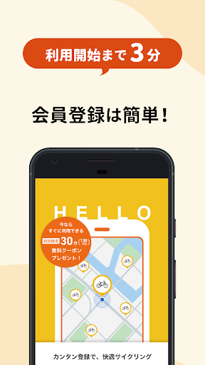 全国9,000カ所以上でシェアサイクルが利用できる、HELLO CYCLING - ハローサイクリング! 日常生活から観光まで、さまざまなシーンで移動が快適な「電動アシスト自転車」や「電動サイクル」があるハローサイクリングを利用してみませんか? 【HELLO CYCLINGの特徴】 ・電動アシスト自転車なので移動がとっても快適です。 ・アプリで今いる場所から自転車を簡単貸出予約+返却する場所の予約もできます。 ・貸出は30分から借りられるのでちょっとした移動にも便利です。 (地域によっては時間ごとの料金設定の異なる自転車が混在している場合がございます。アプリで自転車の利用料金をご確認ください。) ・1アカウントで複数台の電動アシスト自転車の予約が可能です。 ご利用いただけるシェアサイクリングサービス:daicahri(ダイチャリ)/ベルシェアリング/SHONAN PEDAL(ショウナンペダル)/MY BIKE(マイバイク)/関鉄Pedal/みとちゃり/MaaS Cycle(マースサイクル)/SUNAUTUS MOBILITY(サンオータスモビリティー)/ハレノヒサイクル/PULCLE(パルクル)/いずなかシェアリング/スルガノサイクル/NKPEDAL(エヌケーペダル)/CYCY(サイサイ)/Hi!Cycling(ハイサイクリング)/ballooners cycle(バルーナーズサイクル)/ミクチャリ など ・ICカードを登録しておけばアプリから予約なしでも簡単に貸出が可能です。 【HELLO CYCLINGの利用シーン】 ・近所の買い物、ちょっとした移動に。 ・通勤や通学時、日常的な移動に。 ・レジャーや観光先での移動に、思い出作りに。 ・鉄道の運休や災害時など、もしもの時の移動に。 【ご利用方法】 1.まずは、会員登録!会員登録による月額費用などは一切なし。最短1分で完了! メールアドレス、Apple、Facebook、Yahoo!JAPAN IDでもアカウント登録ができます。 2.全国にあるHELLO CYCLINGのステーションを見つけよう 無料会員登録後、アプリを起動し利用したいエリアから付近のステーションを見つけ、自転車をご予約ください。 3.ステーションへ向かい、自転車のロックを解錠 アプリ上で予約した「車両番号」を確認し、アプリでボタンを押す。もしくは、「自転車の車両番号」発行された4桁の暗証番号を入力すると、ロックが解除されシェアサイクルが開始されます。 4.電動アシスト自転車なので目的地まで快適にライド! 130円/30分からご利用いただけます。 (地域によっては時間ごとの料金設定の異なる自転車が混在している場合がございます。アプリで自転車の利用料金をご確認ください。) 5.近くのステーションで自転車を返却 返却したいステーションへ自転車を戻し、鍵は手動で施錠します。 自転車に設置されている、鍵についている「RETURN」ボタンを押して返却。もしくは、操作パネルの「RETURN」ボタンを押し、「1」(YES)を押して完了! 【お支払い方法】 ・PayPay ・クレジットカード ・キャリア決済(NTTドコモ・au・ソフトバンク) ・Yahoo!ウォレット ・WebMoney その他お支払い方法は公式Webサイトまたは、アプリからご確認ください。 【ご利用上の注意】 ・ご利用前に、必ず利用規約をお読みください。 ・本アプリケーションは、端末の位置情報およびBluetooth機能を利用します。 ・料金プランはエリアによって異なります。 ・予約なしで貸出を行う場合は、必ず借りたいステーションに自転車があるとは限りませんのでご注意ください。