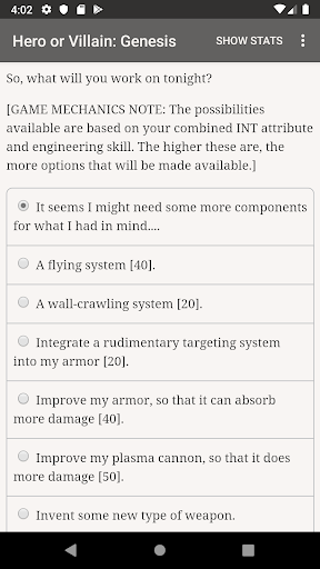 Become the greatest hero or villain that the world has ever known! Balance the challenges of leading a normal life, while attempting to defeat evil…or wreak havoc on the world. Hero or Villain: Genesis is a 350,000 word interactive novel by Adrao, where your choices control the story. The game is text-based, with artwork to help set the scene. Will you hunt down villains to the last corner of the planet, join a group of fellow heroes (or villains!), defeat New York\s criminal mastermind, or even replace him? • Choose from dozens of powers. You can pounce on your enemies with the power of your fists, strike them down with hellfire, take control of their minds, dodge their attacks with your super-speed, or rewind time to learn from your mistakes. • Build your own gadgets, improving the quality of your armor or the weapons mounted on it. • Make alliances with other heroes, and attempt to find a sidekick that works with you. • Play as male, female, or non-binary, and romance many of the other characters! • Several illustrations to enhance your experience. • Many different game paths, with over two dozen different endings. • Several difficulty settings. Play as a mighty invincible hero, or just somebody only slightly more powerful than an average human.