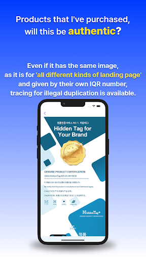 When you are not sure about the authenticity of the product! When you want to enjoy worry-free shopping! Market-leading authenticity verification solution! HiddenTag offers authentication, verification, and shopping at once. ▷ 3 steps to shop safely with Hiddentag 1. Make sure that your purchased product has a Hiddentag smart label. 2. Scan the HiddenTag smart label and check the authenticity result. 3. Check out more about brands selling genuine products from the Hiddentag store and make secure purchases. ▷What to do if your product is shown as a counterfeit? :( 1. Request authenticity check via “Report Counterfeit” function of HiddenTag and get the final result on authenticity status. 2. If at any point a store is suspected of offering counterfeit product, please share the information of that store in “Review” section to warn others. ▷ Check Shopping Trends! 1. See the global sales rank of various brands. What brands are popular in other countries? 2. Get more information about K-beauty, cosmetics, fashion trends etc [Main functions of HiddenTag] ★Hiddentag★ Product authenticity verification / product registration You can authenticate your purchase by registering your product after checking the authenticity via HiddenTag ★Hiddentag★ Information about brands adopted HiddenTag Here are some brands that can verify the authenticity with HiddenTag. Claire, Clio, Aekyung, 3CE, Benton, YG Entertainment and more than 600 companies are using HiddenTag. ★Hiddentag★ HiddenTag store for genuine products only. Discover more and more genuine product from HiddenTag store. Only 100% guaranteed genuine products are introduced here. ★Hiddentag★ Various Contents HiddenTag lets you know the trendy products and brands of Korea. We will inform you about beauty, fashion and trends in multiple languages such as Chinese, English, Vietnamese, Thai and Japanese HiddenTag is the proprietary technology and TM (Trademark) of CK&B Company. Instagram : https://www.instagram.com/hiddentag_international/ Homepage : http://www.hiddentag.com/nation/usa/main.jsp Thank you. Service Hotline: (82)-070-8257-1414 Email: hiddentag@cknb.co.kr Business Hours: 9am-18pm (KST) Mon-Fri.