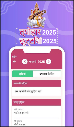 2025 हिंदी कैलेंडर - Hindi Calendar 2025 is offline calendar & free calendar app for all Hindi speaking in india. Hindu calendar apps is highly useful to know festivals, holidays, Shubh Muhurat & Hindi panchang 2025 also 2025 calendar Hindi offline calendar - \All the features of the app works without internet and app is free of money\ Hindi calendar download for FREE with Daily horoscope rasiphal Summary of app: Sunrise and Sunset timings Hindi Calendar 2025 Festivals of 2025, Holidays of 2025 Shub Muhurt dates of 2025 (Marriage dates, Grih Pravesh dates, Vehicle purchase details, Namakaran dates) Nakshatra & Rasi details, Fasting days in every month Government Holidays 2025 Hindi Panchanga and Horoscope details daily, monthly and yearly Hijjra Dates with hijri calendar 2025 Hindi Astrology info or Hindi astrology details ( हिंदी राशिफल ) Share the hindi astrology 2025 / hindi rashifala (ज्योतिष) across your friends & family Hindi Calendar 2025 Calendar images (From January 2025 - December 2025) App Flow: -Simple UI/UX new material design -Buttons: Calendar, Holidays, Shub Muhurt hindi calendar 2025 -Buttons: Daily Horoscope, Monthly Horoscope and Yearly Horoscope (Holidays button has Holiday list 2025 and Festival list 2025) (Shub Muhurt button has Marriage dates / wedding dates, Namakaran dates, Grih Pravesh dates, Vehicle purchase dates) (Horoscope button has all rashifala horoscope in Hindi) हिंदी कैलेंडर 2025 को हिंदू कैलेंडर और भारतीय कैलेंडर भी कहा जाता है। कैलेंडर में सभी पंचांग और कुंडली विवरण हैं। हिंदी पंचांगम 2025 कैलेंडर ऐप में 2025 के लिए त्यौहार और अवकाश सूची है। ऐप भी उपवास दिवस और 2025 के शुभ दिन पर विवरण देता है App Features: Hindu Calendar 2025 has Date Month Tithi (तिथि) Nakshatra Rashifala etc for 2025 Shubh Muhurt details (Marriage dates, Vehicle Purchase, Namakaran, Grih Pravesh) sanatan panchang 2025 Details of Hindu auspicious days Zoom in / Zoom out the calendar Hindi Calender almanac for 2025 2025 Panchangam for Hindi speaking people Daily timings of Sunrise, Sunset, Moonrise, Moonset, Nakshatra, Yoga, Karna, Sunsign, Moonsign, Rahu Kal (राहू काल), Gulikai Kal Religious / Auspicious dates & details Hindi Rashifala details, Hindi Horoscope and Panchangam completely FREE Daily horoscope in Hindi Indian Bank Holidays 2025 Best Hindi calendar for 2025 & Best Hindu Calendar in Hindi for 2025 हिंदी कैलेंडर 2025 is offline & free calendar app created for Indians and Hindi speaking people across the globe. this Hindu calendar app will be useful for all users Hindi Calendar 2025 : Best hindi calendar 2025 app. This free calandar includes all months calendars, Festivals, Holidays and Shub Muhurt (Marriage dates, Vehicle purchase date, House warming / Griha pravesha dates). Also has details of Hindi Kundali Hindu calendar 2025 in Hindi - हिंदू कैलेंडर 2025: Can easily find the timings of Sunrise, Sunset Moonrise Moonset Nakshatra Yoga Karna Sunsign Moonsign Rahu Kalam and Guli Kalam Hindi Calendar 2025 Hindu Panchang calendar 2025 (हिंदी पंचांग): Hindi Panchangam 2025 gives all the astrology and horoscope details. App also has Daily Panchang (पंचांग) including the today horoscope (राशिफल) tithi. Its a hindu calendar 2025 with offline calendar which shows today\s Panchang in Hindi - Panchang List 2025 & additional Panchak List 2025 Indian Festival and Indian Holiday list: List of all holidays and festivals are present in this app. - Hindu Holiday List (छुट्टी 2025) - Muslim Holiday List with all festivals - Christian Holday List - Muslim festivals List - Christian festivals List - Hindi festivals Kalendar Hindi 2025 - Quickly gives Hindi date today and Hindi Panchagam - Panchangam List 2025 Thanks for downloading हिंदी कैलेंडर 2025. Upcoming features: -Holiday List 2025 -Hindi calendar 2025 with fasting days (हिंदी कैलेंडर 2025) -Hindu Panchang 2025 with Tithi, Nakshatra and Rasi हिंदी कैलेंडर 2025