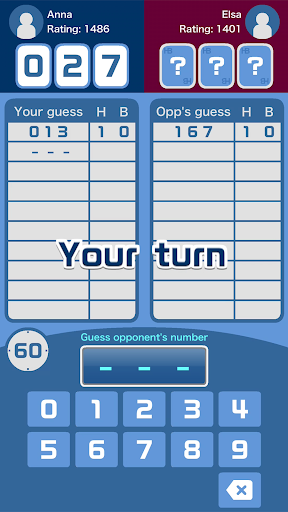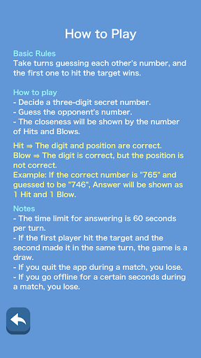 Hit and Blow (also known as Bulls and Cows) is a classic code-breaking game for two players. Basic Rules Take turns guessing each other\s number, and the first one to hit the target wins. How to play - Decide a three-digit secret number. - Guess the opponent\s number. - The closeness will be shown by the number of Hits and Blows. Hit ⇒ The digit and position are correct. Blow ⇒ The digit is correct, but the position is not correct. Example: If the correct number is \765\ and guessed to be \746\, Answer will be shown as 1 Hit and 1 Blow. Notes - The time limit for answering is 60 seconds per turn. - If the first player hit the target and the second made it in the same turn, the game is a draw. - If you quit the app during a match, you lose. - If you go offline for a certain seconds during a match, you lose.