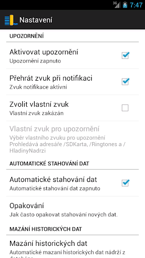 Zajímají Vás informace o hladině a odtoku vody nádrží v České republice? Nebaví Vás stále hledat na stránkách jednotlivých povodí informace o hladině a odtoku nádrží? Potřebuje být upozorněni když hladina nebo odtok vybrané nádrže stoupne nad Vámi nastavenou mez? Aplikace Hladiny vody v nádržích nabízí informace o stavu a hladině a odtoku vody nádrží celé České Republiky. Používá informace ze stránek jednotlivých povodí: » Povodí Ohře » Povodí Vltavy » Povodí Labe » Povodí Moravy » Povodí Odry Funkce aplikace: » Zobrazení seznamu nádrží jednotlivých povodí » Aktuální informace o hladině a odtoku jednotlivých nádrží » Základní informace o nádrži » Zobrazení upozornění pokud je překročena sledovaná hladina nebo odtok na vybraných nádržích » Graf zobrazení posledních 48 hodin vývoje hladiny nádrží » Graf zobrazení posledních 48 hodin vývoje odtoku nádrží » Widget vybraných sledovaných nádrží