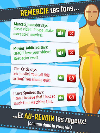 LUMIÈRE ! CAMÉRA ! ACTION ! Si tu rêves de devenir UNE STAR, VOICI TA CHANCE ! As-tu le talent pour conquérire HOLLYWOOD et grimper jusqu’au SOMMET ? Sois la star de tes propres films : des thrillers aux plus DRÔLES des comédies, des films romantiques aux westerns les plus AUDACIEUX… Montre de quoi tu es capable en tant que RÉALISATEUR, PRODUCTEUR ET ACTEUR de tes films ! Tu veux avoir ta propre ÉTOILE sur le MUR DE LA GOIRE ? Tu veux gagner un Leonardo diPrize UNIQUE ? Devenir MILLIARDAIRE ? Avoir des tonnes de FANS ? Qu’est-ce que tu attends ? Clique et commence à gérer la plus grande carrière qu’Hollywood a jamais vu : LA TIENNE ! GAMEPLAY • Choisis le genre de film que tu veux faire : de la fantasy, de la science-fiction, des films pour enfants, de l’action, de l’horreur, des super-héros et même du space opera ! Il n’y a PAS DE LIMITE ! Libère ta créativité pour gagner l’adhésion du public ! • Clique et enregistre tes films ! • Reçois les avis des critiques • Améliore ton studio et ta maison • Engage des employés • SOIS CÉLÈBRE CE QUI T’ATTEND • Améliore ton équipement pour impressionner les critiques : une meilleure caméra, de meilleurs décors, de meilleurs micros, et bien plus encore • Fais attention à ton équipe : une vraie STAR a besoin du meilleur réalisateur et des meilleurs techniciens ! • Distrais ton public et gagne de l’argent ! • I Améliore la qualité de tes films et gagne plus d’argent ! Le TAPIS ROUGE t’attend ! Tu vas devenir une vraie STAR ! Veuillez noter! Ce jeu se joue gratuitement mais contient certains articles pouvant être achetés avec de l\argent réel. Certaines fonctionnalités et suppléments mentionnés dans la description peuvent devoir être achetés avec de l\argent réel.