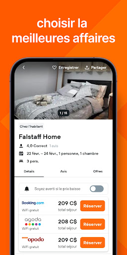 Hôtels pas chers・L\application Hotels70 facilite la recherche et la comparaison des prix des hôtels. Notre application de réservation d\hôtels en ligne propose des hôtels de luxe, des locations de vacances, des motels, des séjours et toutes sortes d\hébergements. Nous comparons les meilleurs fournisseurs d\offres d\hôtels comme Airbnb, Expedia CA, Booking.com, Trivago, Vrbo Vacation Rentals, Tripadvisor, Hotels.com, Hotwire Canada, Priceline, Travelocity, Travelodge, Agoda, Orbitz, Oyo, Hotel Tonight, Dayuse, Trip com, et bien d\autres. De plus, notre application d\hôtels bon marché vous aide à trouver des offres d\hôtel exclusives de dernière minute. Notre objectif principal est toujours de fournir à nos utilisateurs des hôtels à prix réduits pour des séjours parfaits. Ainsi, nous sommes affiliés à tous les principaux réseaux de réservation d\hôtels tels que Doubletree, Novotel, Ritz Carlton, Fairmont, Shangri-la, Radisson Hotels, Delta Hotels, Ibero Star, Mercure, Accor, IHG, Riu Hotels, Premier Inn, Choice Hotels, Fairfield Inn, Jurys Inn, Hyatt, Hilton, Best western, Holiday Inn, et bien d\autres. Rechercher des hôtels et réserver des chambres d\hôtel pas chères : ➤ Recherchez des hôtels et comparez les prix des hôtels en quelques étapes simples. ➤ Entrez votre destination, sélectionnez la date, ajoutez le nombre de personnes et cliquez sur rechercher. ➤ Le reste, nous le ferons pour vous. Nous comparerons des milliers de fournisseurs de réservation d\hôtels en ligne et afficherons les résultats avec les meilleures offres d\hôtels. Caractéristiques supplémentaires des hôtels pas chers ・Hotels70 : ➤ Notre application de réservation d\hôtels bon marché permet aux utilisateurs de réserver toutes sortes d\hébergements comme des locations de vacances, des motels, des séjours, des hôtels de luxe, etc. ➤ Réservez un hôtel en utilisant l\option Hôtels pas chers à proximité pour trouver des hôtels près de chez vous. ➤ La réservation d\hôtel de dernière minute est facilitée avec nous. Trouvez un hôtel pour votre séjour parfait à tout moment. ➤ Obtenez des hôtels de luxe, des motels, des séjours, des locations de vacances de luxe et toutes sortes d\hébergements. Réservation d\hôtel de dernière minute : ➤ Vous recherchez les meilleures offres d\hôtels ? Trouvez un hôtel même à la dernière minute de votre voyage. ➤ Nous vous aidons à livrer les meilleurs hôtels même à la dernière minute avec des économies importantes sur votre budget. ➤ Nous comparons les prix des hôtels sur les fournisseurs de vacances de dernière minute comme Airbnb canada, Expedia CA, Booking.com, Trivago, Vrbo Canada, Tripadvisor, Hotels.com, Hotwire Canada, Priceline, Travelocity, Travelodge, Agoda, Orbitz, Oyo, Hotel Tonight, Hostelworld, Trip com, et bien d\autres. Il est maintenant facile de réserver un hôtel pour votre voyage. Obtenez des hôtels économiques la prochaine fois avec nous. Téléchargez Hôtels pas chers・Hotels70 et obtenez plus d\avantages.