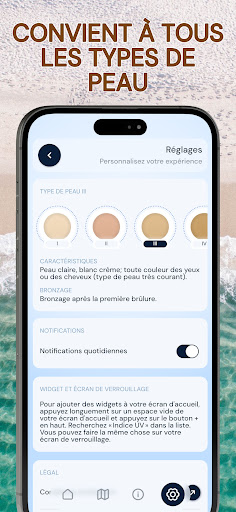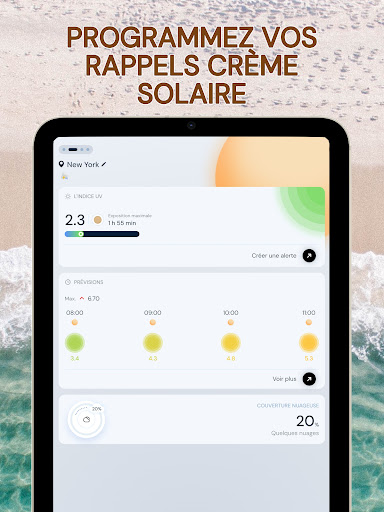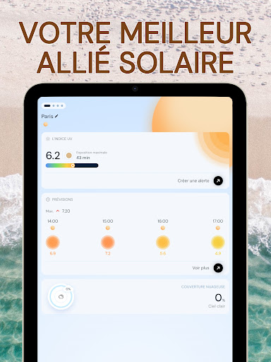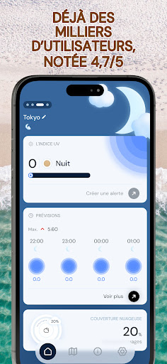 Grâce à notre application Indice UV Numérique utilisant les meilleures données météorologiques, mesurez avec précision l\indice UV où que vous soyez. Protégez votre peau en surveillant l\indice UV pour éviter les coups de soleil et réduire le risque de cancer. Utilisez notre widget pratique pour avoir les informations essentielles directement sur votre écran d’accueil, garantissant une sécurité maximale lors de votre exposition solaire. Sur la base de l\échelle de Fitzpatrick, permettant de classer les individus selon la réaction de leur peau lors d\une exposition solaire, vous pouvez choisir votre type de peau. Vous obtiendrez ainsi des valeurs personnalisées concernant votre exposition maximale au soleil avant de brûler. Créez des alertes d\indice UV sur chaque localisation afin de savoir quand vous mettre à l\ombre ou pour rappeler à vos proches de remettre de la crème solaire. Les prévisions météo précises prennent en compte la couverture nuageuse pour vous informer des conditions d\exposition solaire en temps réel. Avec notre nouvelle mise à jour, ajoutez jusqu’à 6 localisations pour comparer les indices UV de chacune d\entre elles. L\application prend en compte l\altitude dans ses calculs, idéale pour planifier des activités en montagne comme la randonnée et le ski sans risquer de brûler votre peau. Profitez des bienfaits de la vitamine D tout en minimisant les risques pour votre peau grâce à des prévisions détaillées et des alertes en temps réel. Recevez des notifications matinales quotidiennes vous informant de l\intensité de l\indice UV pour la journée, vous aidant à vous préparer au mieux. Notre widget UV pratique vous permet de suivre l\indice UV en un coup d\œil, directement sur votre écran d’accueil. Maximisez votre bronzage en toute sécurité, en évitant les brûlures et en prenant soin de votre peau. L’application prend en compte la météo et la couverture nuageuse pour vous fournir des informations précises et à jour sur l\exposition solaire. Que vous soyez à la plage, en montagne ou dans votre jardin, notre application vous aide à profiter du soleil en toute sécurité. La surveillance de l\indice UV est essentielle pour prévenir les risques de brûlure et garantir une sécurité maximale lors de votre exposition solaire. Téléchargez maintenant et transformez votre smartphone en un puissant outil de mesure de l\indice UV et de protection solaire. Si notre application vous plaît, n’oubliez pas de la noter et de partager votre expérience avec vos amis et votre famille. Encouragez tout le monde à profiter du soleil sans risquer leur santé, tout en optimisant les bienfaits de la vitamine D. Profitez de chaque moment ensoleillé sans souci grâce à notre application. Que ce soit pour un bronzage optimal ou simplement pour bénéficier des bienfaits de la vitamine D, notre application vous guide pour une exposition solaire saine et sécurisée. Avec notre widget pratique, restez informé en permanence de l\indice UV de votre localisation et prenez soin de votre peau. Notre application est conçue pour vous offrir une sécurité maximale lors de votre exposition au soleil. En surveillant l\indice UV et en vous fournissant des prévisions météorologiques précises, vous pouvez éviter les risques de brûlure et les dangers associés à une exposition excessive au soleil. Gardez votre peau protégée et profitez du soleil en toute tranquillité. Les alertes et prévisions détaillées vous assurent de toujours savoir quand vous exposer au soleil et quand vous protéger. N\oubliez pas de noter l\application si vous l\aimez ! Vos retours sont précieux pour nous aider à améliorer continuellement nos services et vous offrir la meilleure expérience possible. Partagez votre expérience et encouragez vos proches à adopter des habitudes saines d\exposition solaire grâce à notre application innovante.