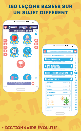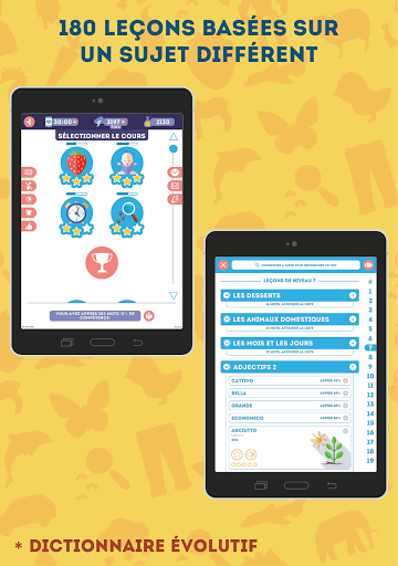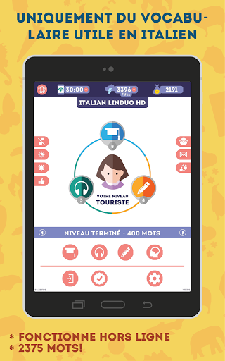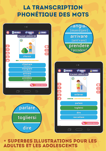 NOS AVANTAGES: * Prononciation par un locuteur natif * 2375 mots répartis en 180 leçons * Pas besoin d\être connecté en permanence sur internet * Une superbe illustration pour chaque mot * Transcription phonétique de chaque mot * Interface moins lumineuse pour apprendre la nuit * Choix entre une voix d\homme ou de femme * Dictionnaire évolutif intégré dans l\application * Jeu \vrai ou faux\ pour réviser les notions abordées * Des leçons spéciales avec des mots usuels, difficiles, anciens ou aléatoires * Des paramètres de son réglables (musique, locuteur, effets sonores) * Seulement 10 à 15 minutes par jour pour apprendre le vocabulaire * Convient aux adultes et aux adolescents de plus de 13 ans Seulement 10 à 15 minutes par jour Avec 10 à 15 minutes par jour, vous vous souviendrez facilement du vocabulaire italien utile. Lorsqu\on mémorise du vocabulaire, la fréquence des leçons est plus importante que leur durée. Apprendre pendant 10 minutes chaque jour de la semaine sera plus productif qu\une leçon d\une heure. Des leçons d\une minute Nous avons tenu compte de nos vies modernes bien remplies et avons conçu chaque leçon de manière à ce qu\elle ne vous prenne pas plus d\une minute. Ainsi, vous n\aurez plus besoin de courir après le temps pour apprendre l\italien! Quand vous en avez l\occasion, lancez tout simplement l\application et révisez une leçon à la fois. Seulement du vocabulaire utile en italien Italien pour Débutants - est une façon facile et gratuite d\apprendre l\italien! Contrairement à d\autres, nous vous proposons seulement le vocabulaire le plus utile, réparti en 180 thèmes de leçon. La qualité est au rendez-vous ! Illustrations spécialement créées Nous utilisons des illustrations spécialement conçues par des infographistes et des psychologues qui permettent une identification visuelle rapide du sens du mot ou de l\action, sans vous encombrer de détails superflus. Prononciation du vocabulaire par des locuteurs natifs Notre application vous aidera à maîtriser la prononciation du vocabulaire italien! Chaque mot a été enregistré par un locuteur natif professionnel. De plus, vous pouvez choisir dans les paramètres une voix masculine ou féminine. Progression dynamique des leçons L\application augmente la difficulté des leçons au fur et à mesure de votre progression. Pour ce faire, elle garde en mémoire des statistiques sur chaque mot ! Ainsi, en mode orthographe, vous devez insérer les lettres manquantes au début, et quand vous vous sentez prêts, vous tapez le mot sur le clavier virtuel. Modes d\apprentissage rapide L\application comporte quatre types de leçon supplémentaires : pour les mots usuels, les difficiles, les anciens et les aléatoires. Chaque mot peut être inclus dans l\une des listes, vous permettant ainsi de créer des leçons adaptées à vous. Pas besoin de savoir comment lire Si vous ne pouvez pas lire encore, aucun problème! Vous pouvez choisir une transcription phonétique(comme dans un dictionnaire)dans les paramètres. Fonctionnalités supplémentaires Grâce à vos avis, nous améliorons régulièrement l\application avec des mises à jour! Pour vous aider à prendre soin de votre vue, vous pouvez activer le mode nuit d\un simple toucher. Si vous êtes temporairement sans connexion internet, aucun problème! L\application fonctionne aussi hors ligne! Révision des leçons précédentes Beaucoup de bonnes applications ne se concentrent pas suffisamment sur la révision des leçons précédentes. C\est pourquoi nous avons conçu un jeu \vrai ou faux\ : il est très simple, mais particulièrement addictif, et surtout il vous aide à réviser les leçons précédentes et à ne pas les oublier. ASSISTANCE ET CONTACT Si vous avez quelque remarque, question ou suggestion, n\hésitez surtout pas à envoyer un e-mail à admin@lin-duo.com ou utilisez le formulaire de contact inclus dans l\application. Nous serons ravis de vous répondre !