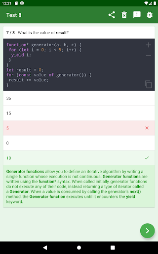 You can test your JavaScript skills with this Quiz. The test is not official, it\s just a nice way to see how much you know, or don\t know, about JavaScript. This will explain briefly all about JavaScript. Whether you are an experienced programmer or not, this app is intended for everyone who wishes to learn the JavaScript programming language by passing tests. Have fun, learn and test all the fundamentals of JavaScript with JavaScript Quiz! Test your knowledge about all the basic features of JavaScript programming. Have fun practicing with the quiz. Further your career - or simply gain a new skills! Good luck!