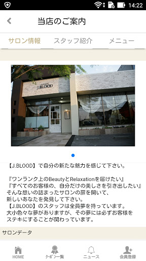 ■予約機能 アプリ上から24時間いつでも予約が可能です。指名予約にも対応していますので、担当スタッフのスケジュールを確認してからの予約が可能です。 ■メッセージ機能 キャンペーン情報やアプリ会員限定のお得な情報をいち早くゲットできます。「予約完了」や「予約変更」などの予約確認もスムーズに「予約日」の前日に確認メッセージも配信されるので安心です。 ■マイページ機能 お客様専用ページから予約状況の確認や変更をすることができます。来店履歴の確認もでき、次回の来店目安もわかりやすくなります。又、お店で撮影したヘアスタイルを見ることができますよ。 ■J.BLOODのホームページへもスムーズに移動することが出来ますので、お気軽に閲覧ください。 他にもアプリならではの機能満載、是非J.BLOOD(ジェイブラッド )のアプリを持って、お店にご来店ください。 ■注意事項 ●このアプリはインターネット通信を利用して最新情報を表示します。 ●一部の機種にて正しく動作しない場合がございますので、 あらかじめご了承ください。