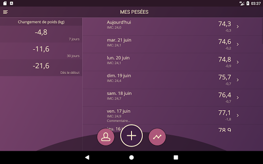 Vous en avez assez des applications avec des fonctions qu’on n’utilise jamais? Nous aussi ! Cette application vous permettra de contrôler votre poids et votre IMC (l’Indice de Masse Corporelle). Point. Rien de plus ! Perdre du poids est devenu un plaisir ! Maintenant vous pouvez suivre l’évolution de votre poids! Le graphique vous montrera combien de kilogrammes il vous reste à perdre ou à prendre pour atteindre le poids idéal. Il vous faut seulement entrer votre poids avec une intervalle nécessaire - l’application vous formera un graphique pour suivre la tendance! Les données peuvent aussi être présentées sous une forme de tableau. Entrez votre taille et l’application vous calcule votre IMC ! L’application : -suit votre poids via les tableaux ou les graphiques -calcule l’Indice de Masse Corporelle