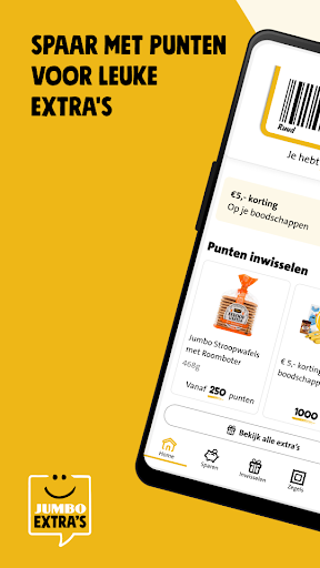 Vanaf nu zijn jouw boodschappen bij Jumbo Extra’s waard! Met de Jumbo Extra’s app spaar je voor gratis boodschappen, de hoogste korting op uitjes en nog veel meer leuke extra’s. Gewoon door je dagelijkse boodschappen bij Jumbo te doen. Scan je Jumbo Extra’s pas aan de kassa, spaar punten en wissel ze in. Geniet ook van allerlei extra services, zoals vlotter winkelen via je persoonlijke kassavoorkeuren! Meedoen is gratis, simpel en duurt maar één minuut. De voordelen op een rijtje - Altijd en overal je Extra’s pas bij de hand - Bekijk je puntensaldo - Alle producten waarop je punten spaart in één overzicht - Wissel je punten in voor de leukste extra’s - Winkel vlotter via je persoonlijke kassavoorkeuren - Spaar samen met je gezin door extra passen te koppelen aan je account - Wijzig eenvoudig je persoonlijke gegevens - En…. natuurlijk verrassen we je op je verjaardag met een lekker cadeautje