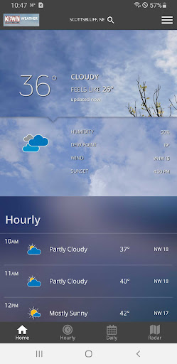 The NBC Nebraska Weather App includes: • Access to station content specifically for our mobile users • 250 meter radar, the highest resolution available • High resolution satellite cloud imagery • Future radar to see where severe weather is headed • Current weather updated multiple times per hour • Ability to add and save your favorite locations • Daily and Hourly forecasts updated hourly from our computer models • A fully integrated GPS for current location awareness • Opt-in push alerts to keep you safe in severe weather • Severe weather alerts from the National Weather Service
