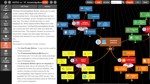 Your ideas. Your knowledge. Perfectly organized. With the InfoRapid KnowledgeBase Builder, you have a powerful tool at your fingertips that takes knowledge and creativity to a whole new level. Capture, organize, and visualize your thoughts in stunning 3D mind maps and knowledge maps – simple, efficient, and clear. The best of both worlds – mind mapping and knowledge management: - Everything in one place: Import websites, Wikipedia articles, and complex data networks from Wikidata, and search your content with full-text search. - Unique visualization: Link information in a 3D mind map that you can flip through like an interactive book. Perfect for large data sets. - Smart automation: Create mind maps from text documents, import Wikipedia articles, or generate mind maps in JSON format with the help of a Large Language Model (LLM) like ChatGPT, and import them directly into the KnowledgeBase Builder – it’s that fast. - Professional diagrams: Design flowcharts manually or generate them from pseudocode. Why choose InfoRapid KnowledgeBase Builder? Store your data securely in a local SQLite database. - Export your mind maps and diagrams as HTML documents or images. - Organize projects, ideas, and knowledge in a clear, structured way. - Discover useful extras like Wikipedia import, text analysis, and a convenient table view. For anyone who wants to visualize complex ideas easily: From creative thinkers to knowledge workers and organizational talents – the InfoRapid KnowledgeBase Builder is for anyone who values structure and clarity. Try it for free, expand it infinitely: The free version gives you everything you need to create a knowledge database. Choose the paid version if you want more than just a database file and enjoy unlimited possibilities. Download the app now and get started!