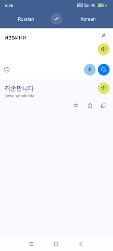 Korean Russian translate provides translations service between Russian and Korean. You can translate words and sentences, helps to learn languages. Features • Translate between Korean and Russian by enter the phrase and sentence, or paste clipboard contents. • High quality translation results with phonetic, which can be used like a Korean and Russian dictionary. • Share translations with other people. • Text to speech: read aloud the pronunciation of the translate results. Voice audio pronunciation requires network connection. • Translate results can be added to your phrasebook for further review. • Simple and easy to use interface.