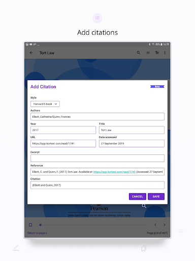Kortext provides access to online and offline eBooks from multiple publishers, with enhanced in-built audio and video content, combined with tools to assist learners and academics to make the most of the content. Features include: - Easy navigation to content, providing quick access to pages - Highlight extracts in a range of colours, enabling quick reference of key sections - Add notes to content and share via email or OneNote, allowing notes from different books to be collated in one area - Add a reference (Harvard or APA), making creation of bibliographies much easier - Read Aloud sections, providing help with accessing content - Increase text size, making it easier to view content