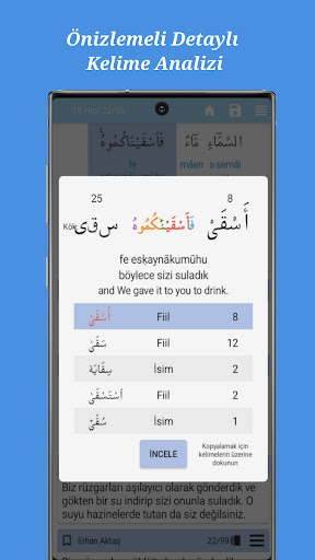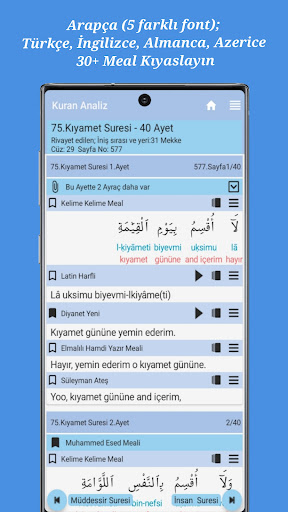 Program tamamen maddi hiç bir beklenti olmadan, sadece hayır için yapılmış bir uygulamadır. İhtiyaç sahiplere ulaşması ve yararlı olması Allah\ın rızasını kazanmak temennimizdir.(reklamsız ve ücretsiz ve dinleme özelliği hariç internetsiz) Diğer uygulamaların eksiklerini hedef alarak geliştirilmiştir. Kuran Analiz - Kuran Meali programı ile Kuranı Kerim Meallerini karşılaştırın, Kuranı Kerim Mealleri üzerinde not alın, Kuran (veya Kuran Meali) okuyun, hatim yapın ,Kuran-ı Kerim içerisinde, meallerde ve kök kelimelerde araştırma yapın. Arapça Orijinal Kuranı Kerim, Latin Harfli okunuş ve birisi İngilizce, ikisi almanca, birisi azerice(Azerbaycan Dili) 25\den fazla Kuran Meali: Ertan Aktaş, Abdulaziz Bayındır(Süleymaniye Vakfı Meali),Elmalılı Hamdi Yazır, Yaşar Nuri Öztürk, Süleyman Ateş, Kadri Çelik, Edip Yüksel, Mustafa İslamoğlu, Diyanet Meali, Bayraktar Bayraklı, Sadık Türkmen ve diğer Kuran Meali Yazarları. Kuran Meali karşılaştırma ve istenilen Kuranı Kerim meal yazarının Kuran meallerini listeleme İstenmeyen Kuran mealini gizleyebilme, istenilen meali ,okuma sırasında göz hizasına getirebilmek için Kuranı Kerim Meallerini istediğiniz sıraya göre sıralayabilme. Gelişmiş Kuran Meali Arama: Girilen kelimelerin eşleştiği(Kuranı Kerim Meallerinin başında da sonunda da geçse, kelime ek alsa da meali bulur). Tüm Kuranı Kerim meallerini listeleme. Kelime kelime Kuran meali, kelimelerin geçtiği ayetleri; kök ve gövde kelime bazlı olarak kategori edebilme, o Ayetin Kuran Mealine gidebilme İstenen ayetleri(mealleri) sonradan inceleyebilmek, Kuran Meali üzerinde not almak için favori ayetler ekranına ekleyebilme. Excel ve Word dosyalarına aktarabilme Kuranı Kerim Meallerini, Kuran Orijinalini ve Latincesini kopyalayabilme, paylaşabilme İstenilen Sure ve Ayete gidebilme, Okuduğunuz yeri kaydedebilme 4 Farklı Tema Arapça ve Kuranı Kerim meallerinin font büyüklüğünü değiştirebilme, Gece temasının fontlarının parlaklığını ayarlayabilme Kuranı Kerim\i Ayet Ayet dinleyebilme. Listeden istenilen seslendiriciyi seçebilme Konulara göre gruplanmış Ayetler- Fihrist (bütün konuları ve ayetleri kapsamayabilir) Program içerisindeki verileri yedekleme, geri yükleme İletişim için Analiz.Kuran@gmail.com