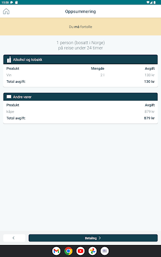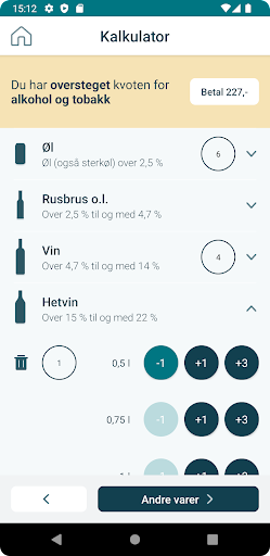 Kvoteappen Kvoteappen er Tolletatens app for å sjekke kvoten og fortolle varer du har med deg utover kvoten. Appen beregner hva det vil koste. Du kan betale avgifter for varene og passere på grønn sone. Hvis du ønsker å ha med alkohol og tobakk ut over kvoten, kan du regne ut hva det koster å fortolle varene. Du kan fortolle til sammen 27 liter øl og vin, 4 liter sterkvin og brennevin, 500 gram tobakk og 400 sigaretter. Du kan også fortolle andre varer enn alkohol og tobakk, opp til en samlet verdi av 20 000 norske kroner per person. Når du har fullført fortollingen, mottar du en kvittering. Du kan da passere på grønn sone uten å henvende deg til Tolletaten. Du kan fullføre fortollingen på forhånd eller rett før du passerer grensen. Hvis du blir stoppet i tollkontroll, viser du frem kvitteringen i appen. Kvitteringen forteller hva du har fortollet, når du fortollet og tidsrommet for når du skal passere grensen. Du kan få tilsendt kvittering på e-post. E-posten er ikke gyldig kvittering ved tollkontroll. Du kan fortolle for én person i tillegg til deg selv. Fortoller du for to, må dere passere grensen sammen. I appen finner du også informasjon om kvoten, verdigrensene, fortolling av alkohol, tobakk og andre varer og andre regler for reisende til Norge. Om personvern i KvoteAppen: http://toll.no/no/om-tolletaten/om-oss/personvern/#kvoteappen Ved sjekk av kvoten sendes ingen informasjon til Tolletaten.