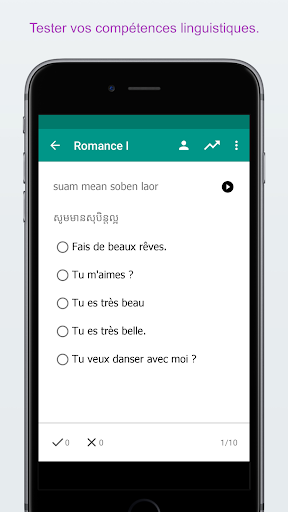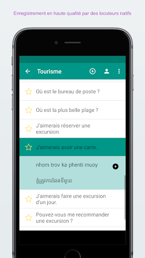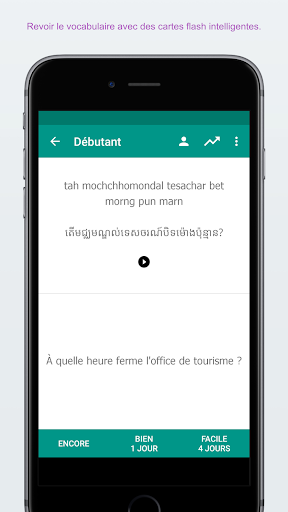 ★★★ Apprenez la langue cambodgienne en visitant le Cambodge ★★★ Le guide de conversation cambodgien est une app de langue cambodgienne gratuite qui vous apprend le cambodgienne simplement et rapidement Tous les mots et phrases cambodgien vous sont présentés en phonétique et en écriture cambodgienne. Ils sont enregistré par une femme orginaire de Cambodge. Sauvergardez vos phrases et mots préférés pour les retrouver facilement. Apprenez le vocabulaire en utilisant la technique de répétition espacée Testez vos connaissances avec des quiz divertissants et comparez vos scores. ★★★ Survivre en voyage en Cambodge ★★★ Utilisez le guide de conversation cambodgien pour survivre en Cambodge Par exemple, laisser l\application parler au chauffeur de taxi en cambodgien pour leur montrer où vous voulez aller Cherchez toutes les phrases et mots pour accéder rapidement à ce dont vous avez besoin ★★★ Caractéristiques principales ★★★ ✓ 400+ phrases et mots cambodgien gratuits ✓ Enregistrés par une fille originaire de le Cambodge ✓ Audio de haute qualité ✓ Technique d\apprentissage de répétition espacée ✓ Quiz cambodgien pour revoir vos compétences ✓ Suivez vos progrès d\apprentissage ✓ Sauvegardez vos phrases et mots préférés ✓ Fonction de recherche rapide ✓ Vue détaillée pour apprendre les phrases mot à mot ✓ Copiez les phrases dans le presse papier (avec un click long sur la phrase) ✓ Jouez le son plus doucement ✓ Ajustez le quiz et les cartes flash pour: Cambodgien -> Français, Français -> Cambodgien, Phonétique -> Français, Français -> Phonétique ★★★ Catégories ★★★ 11 Catégories d\apprentissage gratuite. Apprennez avec 400+ phrases cambodgienne et mots cambodgienne dans les catégories suivantes : Conversation de base cambodgien, Salutations cambodgien, Phrases directions, Mots directions, Hébergement, Manger dehors en Cambodge, Shopping, Tourisme en Cambodge, Urgence, Date et heure, Chiffres 22 Catégories dans la version Pro. Apprenez tous les 1000+ phrases et mots cambodgienne dans la version Pro avec les catégories supplémentaires suivantes : Conversation niveau avancé, Passer la frontière, La banque * Conversations d\affaires, Relations romantiques I, Relations romantiques II, Téléphone & Internet, Lieux, Loisirs, Nourriture, Fruits, Légumes, Corps humain, Sentiments, Animaux, Professions, Questions, Santé, Couleurs, Pays, Famille, Le bureau de Poste ★★★ Vos commentaires nous intéressent ★★★ Si vous aimez cette application, merci de prendre un instant pour nous noter ou donner votre avis. Si vous avez des suggestions, avis ou conseils je serai ravie que vous me les fassiez parvenir à support@simyasolutions.com. ★★★ A propos ★★★ Site Internet : www.simplylearnlanguages.com/khmer Contactez-nous : facebook.com/simplylearnlanguages Amusez-vous bien à apprendre le cambodgien!