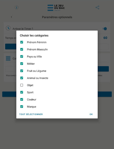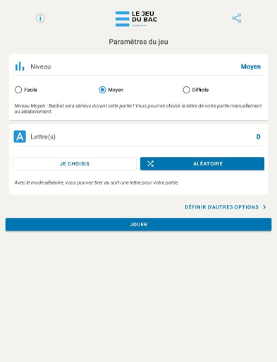 Vous souvenez-vous du \Jeu du Baccalauréat\ ou \Petit Bac\ ? Retombez en enfance et mettez au défi vos ami(e)s en temps réel avec ce jeu gratuit durant les vacances, Noël, les soirées entre amis, ou vos trajets. en temps réel 1. Choisissez le niveau de votre partie. 2. Choisissez votre lettre, ou une lettre par catégorie en fonction du mode choisi. 3. Vous pouvez définir d\autres options (ajouter un minuteur ou choisir les catégories de votre partie). 3b. Si vous jouez en multijoueur, communiquez le code à votre adversaire. 4. Pour chaque catégorie, trouvez un mot commençant par la lettre choisie. 5. Essayez de terminer la partie avant que le minuteur ou votre adversaire ne l\arrête. 6. A la fin de la partie, les points sont attribués automatiquement (sauf pour les catégories que vous avez ajoutées) de la manière suivante : - 2 points : Votre mot est juste, - 1 point : Votre mot est le même que celui de votre adversaire, - 0 point : Vous n\avez rien trouvé ou votre mot est faux. 7. Vérifiez qu\ils soient bons (réajustez si nécessaire) et découvrez ensuite votre score final. Celui qui a le score le plus élevé a gagné ! **** Nouveauté : Le mode multijoueur est arrivé ! Vous pouvez dorénavant jouer en temps réel contre vos amis. De plus, les mots sont corrigés automatiquement avec une base de données de + de 70 000 mots. Les mots non validés par l\application sont analysés et ajoutés s\ils existent. La base de données est donc alimentée régulièrement, et ce, grâce à VOUS ! **** Vous l\aurez compris, c\est en alliant réflexion, rapidité, stratégie et connaissance que vous pourrez être plus rapide que le minuteur ou votre adversaire et le battre. Amusez-vous bien !