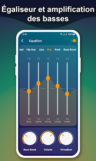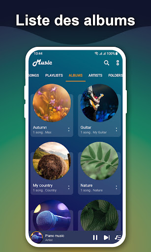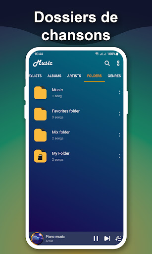 Caractéristiques de l\application : - Lecteur de musique depuis la mémoire de votre téléphone - L\application est conçue avec de nombreuses belles interfaces, que vous pouvez personnaliser avec 5 thèmes de couleurs différents - L\égaliseur sonore dispose de nombreux modes intégrés et d\une puissante personnalisation des basses - Fonction de lecture aléatoire de chansons - Personnalisez les listes de lecture en fonction de l\emplacement souhaité - Vous pouvez régler une minuterie pour éteindre automatiquement la musique après une période de lecture - Fonction de recherche rapide et pratique - Vous pouvez définir votre chanson préférée comme sonnerie de téléphone - L\application dispose de 4 thèmes de joueurs différents que vous pouvez modifier selon vos préférences
