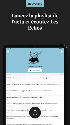 Les Echos est le quotidien économique de référence depuis 1908. Grâce à nos 200 journalistes experts en économie, finance, bourse et actualités internationales, nous vous proposons une meilleure compréhension des enjeux en France, en Europe et dans le monde. Avec des sujets d’actualité, des grandes enquêtes, des vidéos, des infographies mais aussi des podcasts, Les Echos offre une information vérifiée, complète et approfondie. UNE OFFRE ÉDITORIALE UNIQUE POUR SUIVRE ET COMPRENDRE L’ACTUALITÉ ÉCONOMIQUE ET FINANCIÈRE Avec l’application Les Echos, restez au courant des dernières actualités économiques et politiques en France, en Europe et à l’international, grâce à des contenus exclusifs : - Accédez facilement à nos articles, nos analyses, nos reportages et nos interviews pour un décryptage complet et efficace des actualités. - Approfondissez l\actualité à travers l’ensemble de nos rubriques : Economie, Politique, Finance/Marchés, Entreprises, Industrie, International, Start-up, Patrimoine, Le Mag Week-End... - Activez les notifications pour être alerté en temps réel des derniers faits d’actualités majeurs, notamment la couverture des différents secteurs de l’industrie (Automobile, Tourisme, Aéronautique, Défense, Consommation/Distribution, Energie/Environnement). Retrouvez ainsi au quotidien l’actualité des entreprises du CAC40, des PME et des start-ups. UNE EXPÉRIENCE FLUIDE ET PERSONNALISÉE POUR VOUS INFORMER EFFICACEMENT Profitez de l’ensemble des services et fonctionnalités de l’application Les Echos pour vous informer efficacement : - Depuis l’onglet “Accueil”, une sélection par la rédaction des informations et analyses pour rester informé des actualités économiques, politiques et financières qui font la Une - Dans l’onglet « En continu », la liste de tous les derniers articles publiés, par ordre antéchronologique - Dans l’onglet « 18-20 », la sélection du meilleur des articles publiés sur les Echos chaque jour de la semaine à 18h - L\accès aux éditions papiers des journaux et magazines Les Echos à feuilleter au format numérique et consultables même sans connexion après téléchargement - La possibilité de sauvegarder les articles pour les relire plus tard - Un confort de lecture optimal grâce au thème sombre ABONNEZ-VOUS POUR PROFITER DES AVANTAGES RESERVÉS À NOS ABONNÉS Abonnez-vous directement sur votre application afin de soutenir le travail de notre rédaction et assurer la pérennité de notre journal. Vous profiterez ainsi de nombreux avantages : Abonnement Access : - Articles : accès à l’essentiel de l’actualité économique (hors articles Premium) sur l’application et sur le site web en créant votre compte Les Echos - Une publicité limitée - Abonnement mensuel à 18€ ou abonnement annuel à 199€ Abonnement Premium : - Accès à tous les articles publiés depuis 1991 en illimité, sur l’application et le site web en créant votre compte Les Echos - Accès au journal en format numérique la veille de sa parution, dès 21h30 - Des fonctionnalités exclusives, comme “Mes Secteurs” ou “Mes Téléchargements” (qui permet de lire les articles à la une, même sans connexion internet) - Une publicité limitée - Abonnement mensuel à 39€ Note : le montant de l’abonnement est débité sur votre compte automatiquement à la confirmation de l’abonnement. L’abonnement et son renouvellement peuvent être gérés en vous rendant sur votre compte Google Play après l’achat. UNE APPLICATION AU SERVICE DE NOS FIDÈLES LECTEURS Votre avis nous est précieux pour perfectionner notre application et enrichir votre expérience. Satisfaits ? Un avis positif en haut de page serait apprécié. Questions ou suggestions ? Contactez serviceclients@lesechos.fr (objet : \Application mobile Les Echos\) ou via l\onglet “Plus” > “Aide en ligne” dans l\app. Conditions générales d\utilisation : https://externals.lesechos.fr/mobiles/CGU_Les_Echos.html Règles de confidentialité : https://externals.lesechos.fr/mobiles/Privacy_Les_Echos.html#cookie