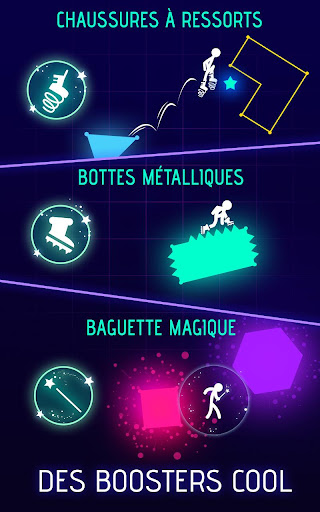 C\est un monde bien sombre pour un p\tit bonhomme comme vous, et il est temps de l\éclairer pour voir resplendir toutes ses couleurs. P\tit bonhomme, sautez, virevoltez et glissez de forme fluo en forme fluo pour les éclairer et les faire resplendir. Récoltez des étoiles en sautant et virevoltant pour augmenter votre score. Mais attention, dès que vous aurez l\impression d\être le meilleur des p\tits bonshommes et que vous brillerez de mille feux en sautant et virevoltant de niveau en niveau, les choses risquent de se compliquer. Les formes de couleur commencent à se déplacer, à pivoter et même à exploser. Des pointes fatales deviennent alors une menace constante pour la vie de votre pauvre petit homme bâton... même lorsqu\il se trouve au beau milieu de l\éclat coloré.\ Si vous ratez un saut, si vous virevoltez mal, ou si vous touchez une pique... Vous disparaitrez dans le néant ! Alors qu\en dites-vous, p\tit bonhomme ? Prêt à sauter, virevolter, éclairer et faire resplendir ?