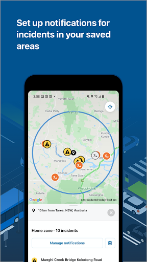Live Traffic NSW provides you with real-time information about unplanned and planned incidents that affect your trips in NSW and across borders into QLD, SA, VIC and ACT. Features include: - Incident information for Sydney and Regional NSW including crashes, breakdowns, fires, floods, snow, public events and roadworks. - Strategically located traffic camera images updated every 60 seconds, which you can save for quick access. - Ability to check for incidents along a route and save your frequently travelled trips. - Cross-border incident information from QLD, SA, VIC and ACT. - Location of fires from NSW Rural Fire Service. - Local road information in Northern NSW (supplied by myroadinfo.com.au). Live Traffic NSW aims to help motorists make the best possible travel decisions that will, in turn, contribute to the safe and efficient management of our roads. Live Traffic NSW is owned and operated by the Transport Management Centre (TMC) which monitors and manages the 18,000km NSW State road network 24 hours a day, 7 days a week. The TMC uses advanced monitoring, communication and traffic management systems to respond to and clear traffic incidents as quickly as possible, improve consistency of journey times, and provide customers with quality up-to-date information. This app also uses data from interstate road agencies (QLD, SA, VIC and ACT), NSW Rural Fire Service, and Northern NSW local roads (myroadinfo.com.au). We\re committed to ensuring that Live Traffic NSW meets the needs of road users in NSW, and your feedback is essential. If you have any ideas, suggestions for improvement or questions about the app, please contact us by using the feedback form within the app.