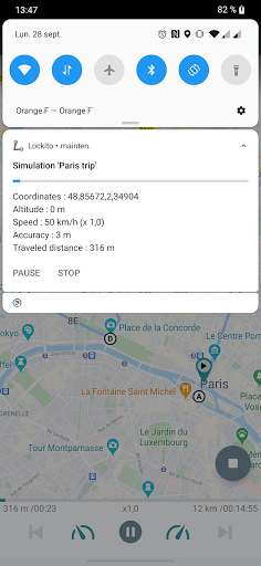 Avant de laisser un commentaire ou une note, merci de consulter la FAQ ici : https://lockito-app.com/troubleshooting.html Lockito vous permet de faire suivre un faux trajet à votre smartphone avec un contrôle total de la vitesse, l\altitude et de la précision du signal GSP. Vous pouvez également simuler une position statique. Cette application est indispensable pour n\importe quel développeur ayant besoin de tester des applications basées sur du géofencing ou juste pour les tester à différent endroits du globe. Important : Si les points semblent \sauter\ à la position réelle pendant la simulation, essayez de désactiver l\utilisation du wifi dans les localisation du téléphone (Paramètres / Localisation / Mode --> Appareil uniquement). Note : Il faut activer les positions fictives dans les options développeurs pour que l\application fonctionne sur un appareil non rooté. Sinon il faut juste déplacer Lockito dans le dossier /system/app (ou /system/priv-app sur Android >= 4.4). Pour cela, vous pouvez utiliser https://play.google.com/store/apps/details?id=de.j4velin.systemappmover Tags: gps, simulation, position, geoposition, geolocation, geofencing, itinéraire, trajet, fake, spoof, mock, location, latitude, longitude, déplacement, itinerary, simuler, marche, vélo, voiture