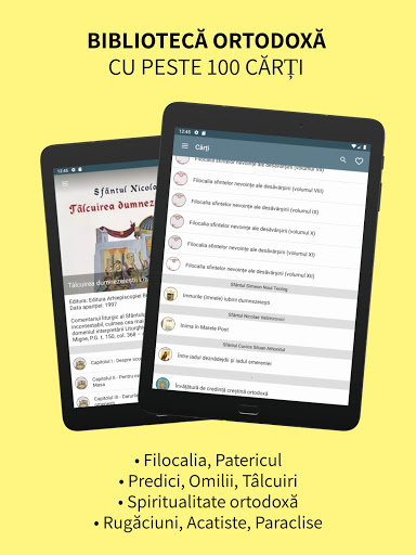 Găsiți principalele informații necesare unui creștin ortodox: - calendarul ortodox 2022-2030 cu notificări și widget, - Biblia (Sfânta Scriptură) în mai multe versiuni, - rugăciuni, acatiste, paraclise, - cărți de slujbă, - cărți de învățătură (Filocalia, Patericul) și ale Sfinților Părinți, - viețile sfinților, - informații despre biserici și mănăstiri, localizare pe hartă. Se pot asculta: - cărți audio, - biblia audio, - emisiuni de învățătură / predici, - posturi de radio ortodoxe. De asemenea găsiți o selecție de conținut video: - emisiuni, - cântări, - filme ortodoxe, se poate urmări: - Trinitas TV - transmisiuni live de la biserici și mănăstiri. Caracteristici: - acces facil la informațiile zilei (sărbători, Evanghelie, Apostol, sinaxar, acatiste, rugăciuni); - informațiile pot fi copiate în telefon pentru a fi accesate și offline; - nu sunt reclame care să vă distragă atenția; - se poate personaliza (culori, temă închisă pentru noapte, dimensiune font); - textul poate fi citit pagină cu pagină ca într-o carte sau prin derulare cum suntem obișnuiți pe calculator; - informațiile se găsesc ușor datorită funcțiilor de căutare; - puteți face liste cu informațiile favorite, se pot marca texte, se pot distribui/copia; - calendarul are un widget care poate fi adăugat pe ecranul de start; - se pot seta notificări pentru sărbători cu roșu, sărbători legale sau sfinți favoriți; Câteva informații despre fiecare secțiune: 1. Calendarul prezintă informații privind praznicele din ziua respectivă: sfinții zilei cu icoanele lor, Viețile Sfinților (varianta pe larg), Sinaxarul, Proloagele, Proloagele de la Ohrida, Predici, Evanghelia și Apostolul zilei, Tropare, Condace, Acatiste, Canoane etc. Calendarul oferă informații pentru perioada 2022-2030 și permite căutări după cuvinte cheie. Calendarul se modifică în funcție de episcopia / mitropolia selectată (sunt sărbători care sunt cu roșu doar într-o anumita zonă) sau se poate trece pe stil vechi pentru a putea urmări sărbătorile din locurile în care se păstrează această rânduială (Sfântul Munte, Ierusalim etc.). De asemenea, vă oferim un index al sfinților atât alfabetic cât și în funcție de perioada în care au trăit. 2. Biserici / mănăstiri grupate pe orașe, județe, regiuni, episcopii, mitropolii etc. sau în funcție de apropierea de locația dumneavoastră. Locașele de cult au informații precum: prezentare, istoric, date de contact, filmulețe de prezentare, locația gps (se poate vizualiza traseul de la locația dumneavoastră), hramul, moaște de sfinți (dacă sunt), preoți slujitori. Momentan sunt introduse majoritatea mănăstirilor și schiturilor din România și bisericile din județul Timiș urmând să introducem cu ajutorul lui Dumnezeu toate locașele de cult ortodoxe din țară și străinătate. 3. Biblia (Sfânta Scriptură) în 4 versiuni: ediția din 1994 tipărită sub îndrumarea Preafericitului Teoctist, ediția redactată de Bartolomeu Valeriu Anania (sunt incluse notele de subsol și referințele), ediția din 1914 Sfântul Sinod (doar Noul Testament), ediția în greaca veche. Se pot face comparații între cele 4 versiuni și se pot vedea trimiterile din cărțile din biblioteca aplicației către un anumit verset (se poate vedea astfel o tâlcuire a lui de către Sfinții Părinți). 4. Biblioteca conține: - Acatiste, Paraclise, Canoane, Tropare, Ceaslovul, Psaltirea, Rugăciuni (atât cele uzuale: de dimineață / seară, înainte / după spovedanie, înainte / după Împărtășanie cât și rugăciuni speciale către Sfânta Treime, Maica Domnului, Sfinți); - Viețile Sfinților (varianta pe larg), Sinaxarul, Proloagele, Proloagele de la Ohrida; - Predici (Parintele Cleopa), Omilii / Tâlcuiri / Explicații (Sfântul Ioan Gură de Aur, Sfântul Nicolae Velimirovici, Pr. Florin Botezan, Mitropolitul Ierothei Vlahos, Arhimandritul Arsenie Papacioc); - Filocalia, Sbornicul; - Patericul Egiptean, Limonariul; 5. Audio - Ascultați posturile de radio ortodoxe care transmit online.