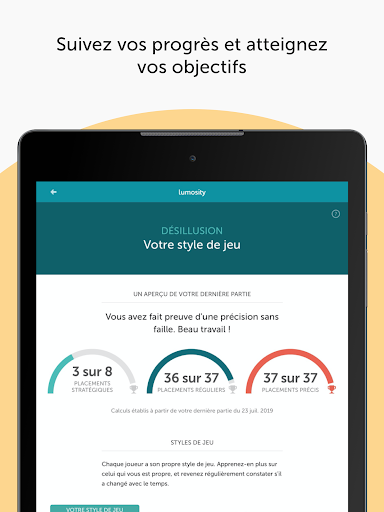 Le programme d\entraînement cognitif de Lumosity est un moyen amusant et interactif d\entraîner votre cerveau et de découvrir le fonctionnement de votre esprit. Utilisé par plus de 100 millions de personnes dans le monde, le programme de Lumosity se compose de jeux conçus pour exercer la mémoire, la rapidité, la flexibilité et la résolution de problèmes. Commencez par un Fit Test de 10 minutes pour déterminer votre score de base et vous comparer aux personnes de votre âge. L\APPLICATION COMPREND •Plus de 30 activités... et ce nombre ne fait que grandir. •Défis de mémoire, rapidité, logique, résolution de problèmes, maths, langue, et plus encore. MODES D\ENTRAÎNEMENT •Des ensembles de jeux choisis spécialement pour vous. •Défis personnalisés basés sur vos habitudes et préférences d\entraînement. ANALYSES D\ENTRAÎNEMENT DÉTAILLÉES •Des informations sur vos points forts et faibles à mesure que vous progressez dans l\entraînement. •L\analyse de votre façon de jouer permet de comprendre vos schémas cognitifs L\HISTOIRE DE LUMOSITY Nous sommes une équipe de scientifiques et de concepteurs qui explorent de nouvelles façons de mettre le cerveau à l\épreuve et de faire progresser la recherche cognitive. Nous prenons des tâches cognitives et neuropsychologiques courantes ou créons des défis expérimentaux entièrement nouveaux. Puis, en collaboration avec des concepteurs expérimentés, nous transformons ces tâches en jeux et en énigmes qui mettent à l\épreuve les compétences cognitives de base. Nous travaillons également avec plus de 40 chercheurs universitaires dans le monde entier. Nous donnons aux chercheurs qualifiés un accès gratuit aux entraînements et aux outils de Lumosity, afin de les aider à étudier de nouveaux domaines des sciences cognitives. Nous vous invitons à vous entraîner avec nous et à participer à notre mission visant à faire progresser la compréhension de la cognition humaine. L\application est disponible en anglais, espagnol, portugais, français, allemand, japonais et coréen. Pour accéder à l\application dans l\une de ces langues, rendez-vous dans la section « Langue » des paramètres de l\application. OBTENEZ DE L\AIDE : http://www.lumosity.com/help SUIVEZ-NOUS : http://twitter.com/lumosity AIMEZ NOTRE PAGE : http://facebook.com/lumosity TARIFS ET CONDITIONS DE LUMOSITY PREMIUM Avec Lumosity Premium, vous vous entraînerez avec un programme personnalisé, vous découvrirez des analyses approfondies sur votre façon de jouer et vous recevrez des conseils pour améliorer votre précision, votre vitesse et votre stratégie de jeu. Nous proposons les abonnements Premium suivants : Mensuel : $11.99 USD/mois Annuel : $59.99 USD/an Ces prix concernent les clients des États-Unis. Les prix dans d\autres pays peuvent varier, et les frais réels peuvent être convertis dans votre monnaie locale en fonction de votre pays de résidence. Les abonnements Lumosity Premium sont débités de votre compte iTunes au moment de la confirmation de votre achat. Votre abonnement se renouvellera automatiquement au prix et à la date sélectionnés ci-dessus, à moins que vous ne désactiviez le renouvellement automatique au moins 24 heures avant la fin de la période en cours. Le renouvellement sera débité dans les 24 heures précédant la fin de la période en cours. Vous pouvez gérer votre abonnement et désactiver le renouvellement automatique dans les paramètres de votre compte iTunes après l\achat. Vous ne pouvez pas obtenir de remboursement pour toute période inutilisée, et toute période inutilisée d\une période d\essai gratuite est perdue après un achat. Politique de confidentialité : https://www.lumosity.com/legal/privacy_policy Confidentialité en Californie : https://www.lumosity.com/fr/legal/privacy_policy/#what-information-we-collect Conditions générales d\utilisation : https://www.lumosity.com/legal/terms_of_service Politique de paiement https://www.lumosity.com/legal/payment_policy