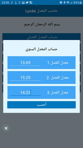 حاسب المعدل Lycée هو تطبيق اندرويد يقوم بمساعدة التلاميذ أو أوليائهم أو الأساتذة الجزائريين على حساب العديد من المعدلات الدراسية لجميع سنوات وتخصصات الطور الثانوي بالجزائر، من بين المعدلات التي يقوم يحسابها التطبيق - المعدل الفصلي - معدل شهادة التعليم الثانوي - المعدل السنوي - معدل المادة - معدل القسم كل ما يتطلب التطبيق هو ملئ علامات التلاميذ في الخانات الموجودة به فيقوم التطبيق بالحساب حسب الطريقة التي يتم بها الحساب في الثانويات الجزائرية مميزات التطبيق: - حجمه صغير - تصميم بسيط - سهل الإستخدام - يحتوي على واجهة خاصة لكل سنة وشعبة - يمكنك عدم احتساب المواد المعفي منها - يكتب المعاملات اوتوماتكيا حسب السنة مع إمكانية تعديلهم