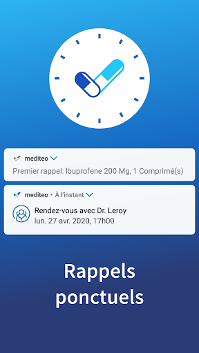 mediteo vous rappelle facilement de prendre vos médicaments de façon régulière. mediteo vous notifie aux heures prévues et vous rappelle la dose correcte. L’application vous permet et peut également vous rappeler d’enregistrer des mesures médicales, des rendez-vous chez le médecin ainsi que de réapprovisionner vos médicaments. mediteo vous aide à respecter votre plan de traitement personnel. CONFIGURATION SIMPLE : cherchez des médicaments dans notre immense base de données ou ajoutez différents médicaments en scannant l’emballage ou votre plan de médicaments fédéral (BMP). RAPPELS PONCTUELS : configurez vos heures de prises et recevez des rappels pour vos prises, rendez-vous et nouvelles ordonnances. Pour cela, mediteo ne doit PAS être installé dans le dénommé Espace privé (à partir d\Android 15), sinon, les notifications ne pourront pas être affichées de manière fiable. INFORMATIONS IMPORTANTES : gardez les informations importantes sur les effets secondaires et les interactions médicamenteuses toujours à portée de main grâce à la notice électronique. SÉCURITÉ DES DONNÉES MAXIMALE : gardez le contrôle total sur vos données, auxquelles ni nous ni nos partenaires n’ont accès. Les données sont uniquement sauvegardées localement par défaut. L’application peut aussi être entièrement utilisée sans inscription. MESURES REGULIÈRES : entrez des valeurs telles que la pression artérielle et le taux de glycémie dans votre journal électronique et recevez des notifications pour les prochaines mesures. CONTACTS FRÉQUENTS : profitez d’une vue d’ensemble de vos médecins ainsi que des pharmacies fréquentées et renseignez-vous sur leurs informations de contact et heures d’ouverture. SYNCHRONISATION FACILE : en option, connectez mediteo à votre CLICKDOC Account pour enregistrer vos données médicales de manière cryptée. APPLICATION GAGNANTE : Profitez avec mediteo d\une excellent application qui, en 2021, a été élue gagnante par Stiftung Warentest, l’association de consommateurs la plus réputée d’Allemagne. Simplifiez-vous la vie et installez mediteo pour des rappels de médicaments fiables ! Vous obtiendrez encore plus de fonctionnalités avec mediteo m+, notre dispositif médical pour améliorer et maintenir l\adhésion thérapeutique : - Informations sur les médicaments : recevez des informations sur vos médicaments, telles que les interactions ou conseils de prise. - Exportation et impression de toutes les données : enregistrez vos statistiques de prise et valeurs de mesure saisies sous format PDF et apportez ce rapport clair chez le médecin. - Zones cibles pour les valeurs mesurées : comparez facilement vos données à vos valeurs cibles personnelles ou aux recommandations de la directive européenne sur la pression artérielle. - Mode sombre : personnalisez l\affichage de mediteo en utilisant le mode sombre. Remarques : vous pouvez tester mediteo m+ gratuitement pendant deux semaines ou l\acheter sous forme d\abonnement par achat in-app. À la fin de la période d\essai, votre compte sera débité des frais d\abonnement si vous n\annulez pas avant la fin de cette période. Les abonnements sont automatiquement renouvelés s\ils ne sont pas annulés au moins 24 heures avant la fin de la période en cours. Vous pouvez annuler votre abonnement à tout moment dans les paramètres de votre compte Google Play. Toute partie non utilisée d\une version d\essai gratuite expire lorsque vous achetez un abonnement. mediteo m+ n\est actuellement disponible qu\en Allemagne et en France. L\application a été produite en 2020 par Mediteo GmbH, Hauptstr. 90, 69117 Heidelberg, Allemagne. Par vos commentaires, suggestions et questions, vous nous aidez continuellement à améliorer mediteo, pour vous. N’hésitez donc pas à nous contacter à support.fr@mediteo.com. Conditions générales d’utilisation et protection des données : https://www.mediteo.com/fr/a-propos/protection-des-donnees-et-conditions-generales-dutilisation/