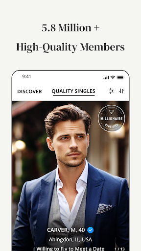 We Invented Upscale Dating! Join MM! Become a VERIFIED MILLIONAIRE to stand out. MillionaireMatch, the Elite Dating and Matchmaking app for Millionaires, is where successful people find serious relationships. We are a true exclusive Millionaires Club. This luxury dating app brings together selectively driven professionals such as executives, entrepreneurs, lawyers, and investors, alongside high-net-worth individuals including celebrities, influencers, millionaires, and billionaires. MillionaireMatch has been in the elite dating world since 2001. For over 20 years, over 5 million high-quality members choose us over general dating apps because they are looking for a more refined experience. MillionaireMatch is the #1 elite matchmaking app for meeting and dating successful, attractive singles. Enjoy these features to meet, date and chat with quality singles on our app: -Discover successful singles near you -Connect with VERIFIED MILLIONAIRE -Chat with Verified Members online -Get 24/7 customer support -Videos -Chatroom -And more! Beyond being the elite matchmaking app, MillionaireMatch stands out for its commitment to facilitating genuine, lasting relationships through intelligent dating. We understand that for many of our discerning members, the ultimate goal is to find a partner for a fulfilling and enduring journey. Our platform transcends the transient nature of casual encounters, focusing on creating opportunities for individuals seeking serious, committed relationships that evolve into lasting unions, fostering a league of like-minded, intelligent individuals in search of meaningful connections within our exclusive community. The MillionaireMatch app is the ultimate Millionaires Club where elites can meet. We have been the industry leader in wealthy dating since 2001. We know our members have high standards and want to be discreet. We strongly believe in protecting members\ privacy. We never share personal information with other apps or companies. At MillionaireMatch, we\re more than just a matchmaking platform; we\re the digital space that nurtures profound relationships within our exclusive league. In an era where one in five relationships begins online, MillionaireMatch staunchly champions the significance of long-term commitments. If you seek a professional, successful partner, meet your soulmate with our #1 trusted dating app for high-quality singles. MillionaireMatch is not a sugar daddy dating app. Those looking for a sugar daddy or sugar baby relationship will result in being banned on our platform. For busy professionals, finding a genuine connection can be challenging, but MillionaireMatch provides a solution. Our platform is not just about dating; it\s about building a future together. Whether you\re seeking marriage, a long-term commitment, or a serious relationship, MillionaireMatch is your gateway to like-minded individuals who appreciate the depth of intelligent dating. Your journey on MillionaireMatch is not just about finding a partner; it\s about embarking on a transformative experience filled with genuine connections. The Premium Membership adds an extra layer of sophistication to your dating journey, making it easier than ever to connect with like-minded individuals who are also seeking serious relationships. To further enhance your experience, we provide 24/7 live support. Your journey on MillionaireMatch is not just about finding a partner; it\s about embarking on a transformative experience filled with genuine connections. Your privacy is always important to us. To view our Privacy Policy and Terms, please visit the following links: Privacy Policy: https://www.millionairematch.com/privacy_policy_ Terms of use: https://www.millionairematch.com/service_agreement/ If you have any problems or suggestions, feel free to contact us at Support@MillionaireMatch.com.