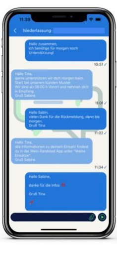 Die „Mein Randstad“ App für Mitarbeiter im Kundeneinsatz bietet Informationen und Erleichterungen im Randstad Arbeitsalltag, wann immer und wo immer der Mitarbeiter es will. Mit Hilfe der „Mein Randstad“ App lassen sich die elektronischen Prozesse noch einfacher bedienen. Neben der elektronischen Zeiterfassung können die Mitarbeiter im Kundeneinsatz Urlaubs- und Zeitkonten ganz einfach über die App einsehen und neue Abwesenheiten beantragen, Entgeltnachweise online abrufen oder mit dem betreuenden Consultant chatten. Weiterhin bietet die App die Möglichkeit, die Mitarbeiter über das News-Feld schnell und unkompliziert über die neusten Meldungen von Randstad zu informieren. Ebenfalls wird die Kommunikation mit der Chat Funktion mit dem zuständigen Consultant und der Niederlassung erheblich erleichtert.