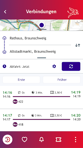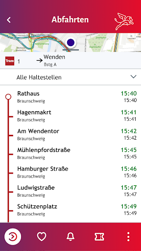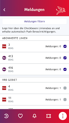 Die neue App der BSVG: Routenplaner, Fahrtenauskunft in Echtzeit und Ticketshop in einem. Meine BSVG ist der praktische Navigator rund um den ÖPNV in Braunschweig und der Region. Alle wichtigen Infos über den Personennahverkehr im Verkehrsverbund Region Braunschweig (VRB) kommen direkt auf das Smartphone, mobile Tickets inklusive. Wir bringen dich hin. Wichtigste Funktionen: • Abfahrten und Fahrtzeiten werden in Echtzeit anzeigt. • Eine schnelle Sofortauskunft ist über die Ortungsfunktion möglich – einfach über die Standortanzeige im Suchfeld oder auf der Karte eine Fahrtabfrage starten. • Besonders wichtige Orte, wie das Zuhause oder die Arbeit, können als Favoriten mit unterschiedlichen Icons hinterlegt und für Fahrtauskünfte beliebig kombiniert werden. • Die Reisebegleitung speichert individuell ausgewählte Verbindungen, um sie später schnell aufrufen zu können. • Mobile Tickets für Fahrten im Verkehrsverbund Region Braunschweig (VRB) gibt es vom Einzelfahrschein über die Tageskarte bis zum Monatsticket. Einfach im Shop registrieren und das gewünschte Ticket kaufen. • In den App-Einstellungen ist die Fahrplanauskunft nach persönlichen Bedürfnissen, z. B. nach Verkehrsmittelwahl, Fußwegoptionen oder Mobilitätseinschränkungen konfigurierbar. Achtung: Zur Nutzung des vollen Funktionsumfanges der App ist eine Datenverbindung ins Internet sowie GPS-Empfang notwendig. Alle Angaben und Auskünfte ohne Gewähr.