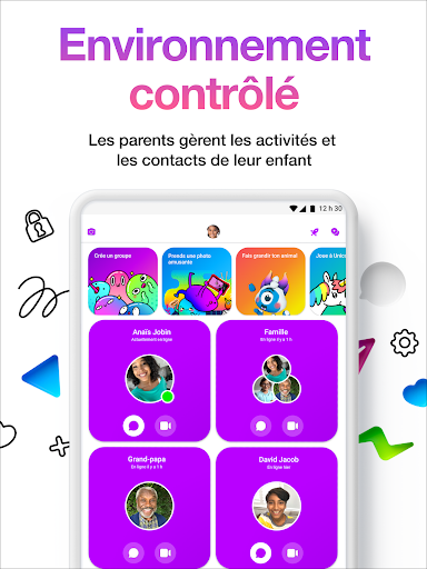 Avec Messenger Kids... Les parents ont plus de contrôle • Les parents approuvent chaque contact, ce qui permet aux enfants de clavarder dans un environnement plus sécuritaire et mieux contrôlé. • Les parents peuvent supprimer un contact à tout moment. • Ils peuvent utiliser le mode veille pour définir des horaires pendant lesquels leur enfant ne peut pas utiliser l’application. • Au cas où les parents voudraient les vérifier, les messages ne disparaissent pas et ne peuvent pas être masqués. • L’application est en téléchargement gratuit et ne comporte pas de publicités ni d’achats intégrés à l’application. Les enfants s’amusent davantage • Les autocollants, les GIF, les cadres et les émoticônes adaptés aux enfants les aident à s’exprimer de façon créative. • Les appels vidéo individuels ou en groupe prennent vie grâce aux masques interactifs et amusants. • La caméra aux nombreuses fonctionnalités permet aux enfants de créer des vidéos et de décorer leurs photos pour leurs proches. Compatible avec Messenger • Les parents et les adultes qu’ils ont approuvés peuvent clavarder avec les enfants par Messenger. • Compatible avec toutes les tablettes et les téléphones intelligents. • Vous n’avez pas besoin d’un numéro de téléphone, mais seulement d’une connexion Wi-Fi. Une conception plus sécuritaire pour les enfants • La création d’un compte Messenger Kids pour un enfant ne lui crée pas de compte Facebook. • Les parents et les tuteurs utilisent leurs propres comptes Facebook pour créer un compte Messenger Kids pour leur enfant. • Les enfants ont la possibilité de signaler ou de bloquer des contacts, et de signaler tout contenu inapproprié. Lorsqu’un enfant envoie un rapport, son parent ou son tuteur en est informé. Nous nous efforçons toujours d’améliorer Messenger Kids. Pour en savoir plus ou pour nous laisser vos commentaires, consultez messengerkids.com.