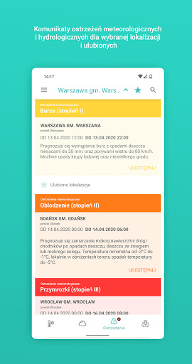 Aplikacja z prognozą pogody IMGW-PIB dedykowana Polsce. To wiarygodne źródło aktualnej i prognozowanej pogody. Tylko w niej integracja wszystkich dostępnych modeli pogodowych, ostrzeżenia, podgląd map radarowych i wyładowań. Aplikacja pozwala również na ustawienie powiadomień z prognozą i ostrzeżeniami. Przejrzysta, nowoczesna, łatwa w nawigacji. Kompleksowa informacja o pogodzie od IMGW-PIB - potwierdzona naukowo. Szukaj Możesz wybrać lokalizację, dla której chcesz poznać prognozę pogody na dwa sposoby. Pierwszy to Szukaj w prawym górnym rogu. Kiedy wpiszesz nazwę miejscowości, aplikacja znajdzie w bazie danych lokalizację, której szukasz i wyświetli dla niej prognozę. Druga możliwość wymaga użycia GPS i dostępna jest poprzez kliknięcie Moja lokalizacja GPS w Szukaj lub w bocznym menu w zakładce Moje lokalizacje > Moja lokalizacja GPS. Jeśli zezwolisz na użycie GPS wyświetli się twoja lokalizacja i prognoza. Ulubione lokalizacje. Aplikacja Meteo IMGW Prognoza dla Polski umożliwia szybki podgląd na skróconą prognozę dla innych wybranych przez Ciebie miast. Kliknij w górnym panelu w gwiazdkę, obok nazwy miejscowości. W ten sposób dodałeś miejscowość do Ulubionych. W rozwijanym panelu pojawi się lista ze skróconą prognozą, a kliknięcie na wybrane miasto przekieruje na szczegóły prognozy w danej lokalizacji. Opcja Ulubione zapisuje również lokalizacje, dla których możesz ustawić powiadomienia PUSH. Pogoda W zakładce Pogoda w pierwszej kolejności znajdziesz prognozę w formie horyzontalnego slajdu prezentującego prognozę na najbliższe godziny. Model pogodowy możesz zmienić w menu bocznym Ustawienia aplikacji > Model pogodowy. Opady prezentowane na wykresie podają dane w mm/h. W zakładce Pogoda znajdziesz również uproszczoną prognozę na najbliższe dni, której długość jest zależna od wybranego modelu pogody. Jeśli dla wybranej przez Ciebie lokalizacji obowiązuje właśnie wydane przez IMGW-PIB ostrzeżenie, pokaże się ono w pasku na górze, w kolorze właściwym dla stopnia ostrzeżenia. Do szczegółów przejdziesz klikając w pasek lub przechodząc do zakładki Ostrzeżenia. Ostrzeżenia Tu znajdziesz ostrzeżenia meteorologiczne i hydrologiczne IMGW-PIB wydane dla wybranej aktualnie i Ulubionych lokalizacji. Szczegółowo opisane, w kolorze przypisanym do danego stopnia ostrzeżenia: Stopień 1 – kolor żółty, Stopień 2 – kolor pomarańczowy, Stopień 3 – kolor czerwony. Aplikacja umożliwia udostępnienie treści komunikatu poprzez naciśnięcie linku Udostępnij. Radary W zakładce Radary znajdziesz podgląd rejestrujący natężenie opadów na terenie Polski. Podgląd umożliwia prześledzenie 7h wstecz sytuacji pogodowej. Wyładowania W tej zakładce znajdziesz podgląd rejestrujący wyładowania na terenie Polski. Prezentowane są one w formie ikon w kolorach dopasowanych do natężenia wyładowania. Podgląd umożliwia prześledzenie wyładowań 7h wstecz. Powiadomienia Aplikacja umożliwia ustawienie powiadomień dla ulubionych lokalizacji. Ustawienia dostępne są w bocznym menu w linku Powiadomienia. Aplikacja udostępnia dwa typy powiadomień: Prognozę - zawierającą skróconą prognozę na dany dzień: temperaturę minimalną, maksymalną, opad, prędkość wiatru i ciśnienie. Ostrzeżenia – aplikacja wysyła komunikat w momencie wydania ostrzeżenia przez IMGW-PIB. Szczegóły Ostrzeżeń dostępne są w zakładce Ostrzeżenia. Aplikacja ustawi powiadomienia tylko dla lokalizacji dodanych wcześniej do Ulubionych. W panelu ustawień możesz ustawić godzinę, o której przyjdzie powiadomienie i model pogodowy prognozy. Moje lokalizacje Znajdziesz tu listę Ulubionych lokalizacji i ostatnio szukane. Listę lokalizacji możesz usunąć w Ustawienia aplikacji> Wyczyść szukane lokalizacje. Ustawienia aplikacji W ustawieniach aplikacji możesz zmienić: model pogodowy (6 modeli), jednostki wiatru, ustawić lokalizację GPS, szybkość odtwarzania animacji na mapie. Tu znajdziesz też linki Pomocy.