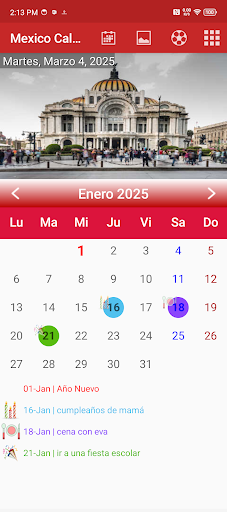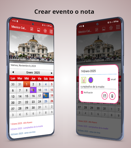 Mexico Calendario con días festivos 2024 - 2028 • Agrega eventos o notas con íconos y colores personalizados. • Marca fechas importantes como vacaciones, aniversarios de bodas o cumpleaños. • Establece eventos anuales recurrentes para recordarlos todos los años. • Personaliza tu calendario con tus propias imágenes. • Recibe recordatorios de los próximos eventos. • Elige comenzar la semana el domingo o el lunes. • Salta a la fecha de hoy o a cualquier fecha específica fácilmente.